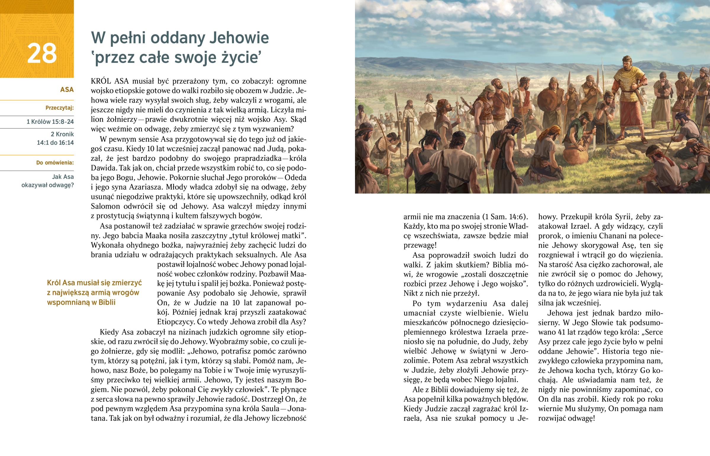 Jehowa jest jednak bardzo miłosierny. W Jego Słowie tak podsumowano 41 lat rządów tego króla: „Serce Asy przez całe jego życie było w pełni oddane Jehowie”. Historia tego niezwykłego człowieka przypomina nam, że Jehowa kocha tych, którzy Go kochają. Ale uświadamia nam też, że nigdy nie powinniśmy zapominać, co On dla nas zrobił. Kiedy rok po roku wiernie Mu służymy, On pomaga nam rozwijać odwagę!