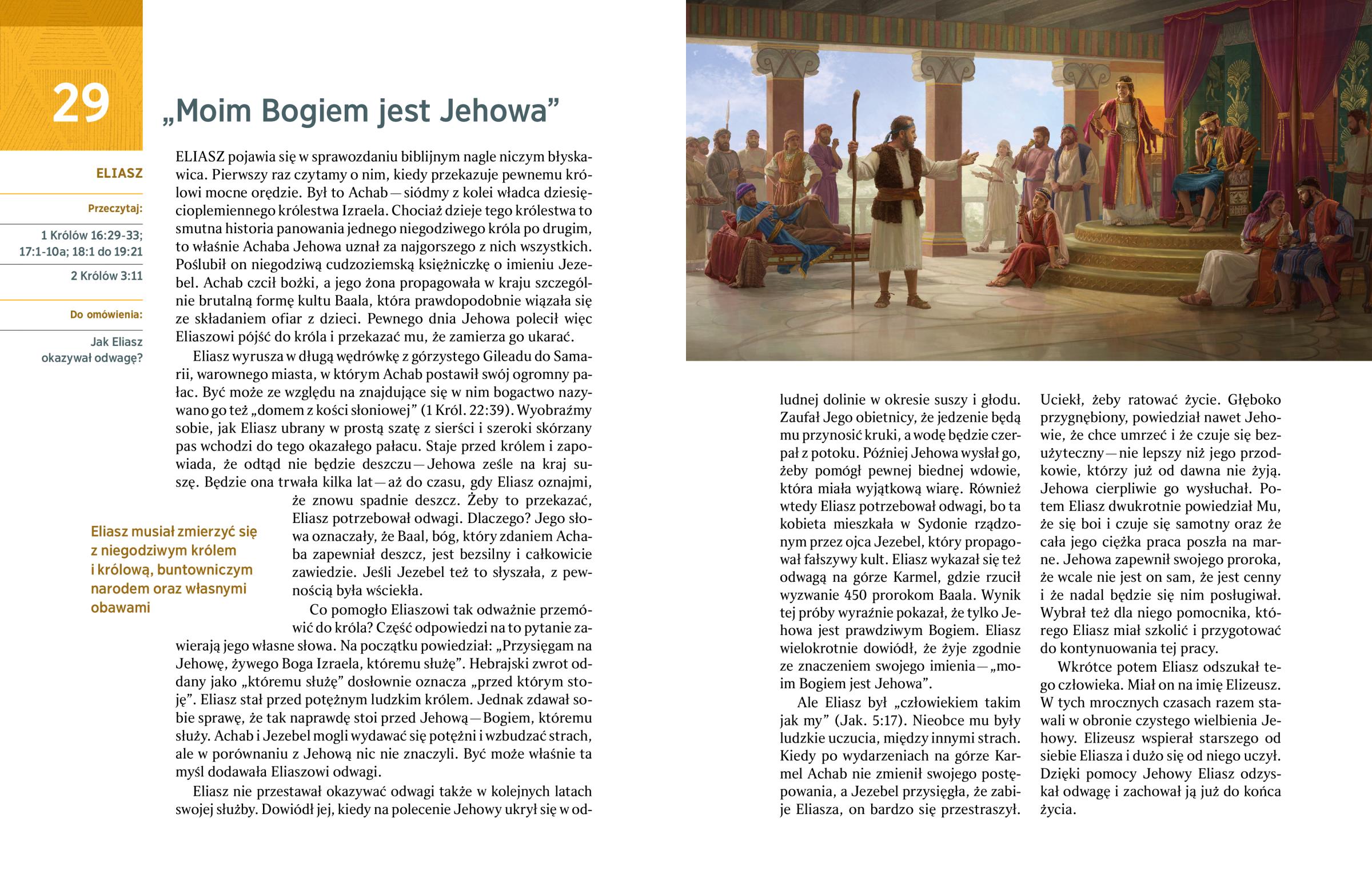 Co pomogło Eliaszowi tak odważnie przemówić do króla? Część odpowiedzi na to pytanie zawierają jego własne słowa. Na początku powiedział: „Przysięgam na Jehowę, żywego Boga Izraela, któremu służę”. Hebrajski zwrot oddany jako „któremu służę” dosłownie oznacza „przed którym stoję”. Eliasz stał przed potężnym ludzkim królem. Jednak zdawał sobie sprawę, że tak naprawdę stoi przed Jehową — Bogiem, któremu służy. Achab i Jezebel mogli wydawać się potężni i wzbudzać strach, ale w porównaniu z Jehową nic nie znaczyli. Być może właśnie ta myśl dodawała Eliaszowi odwagi.