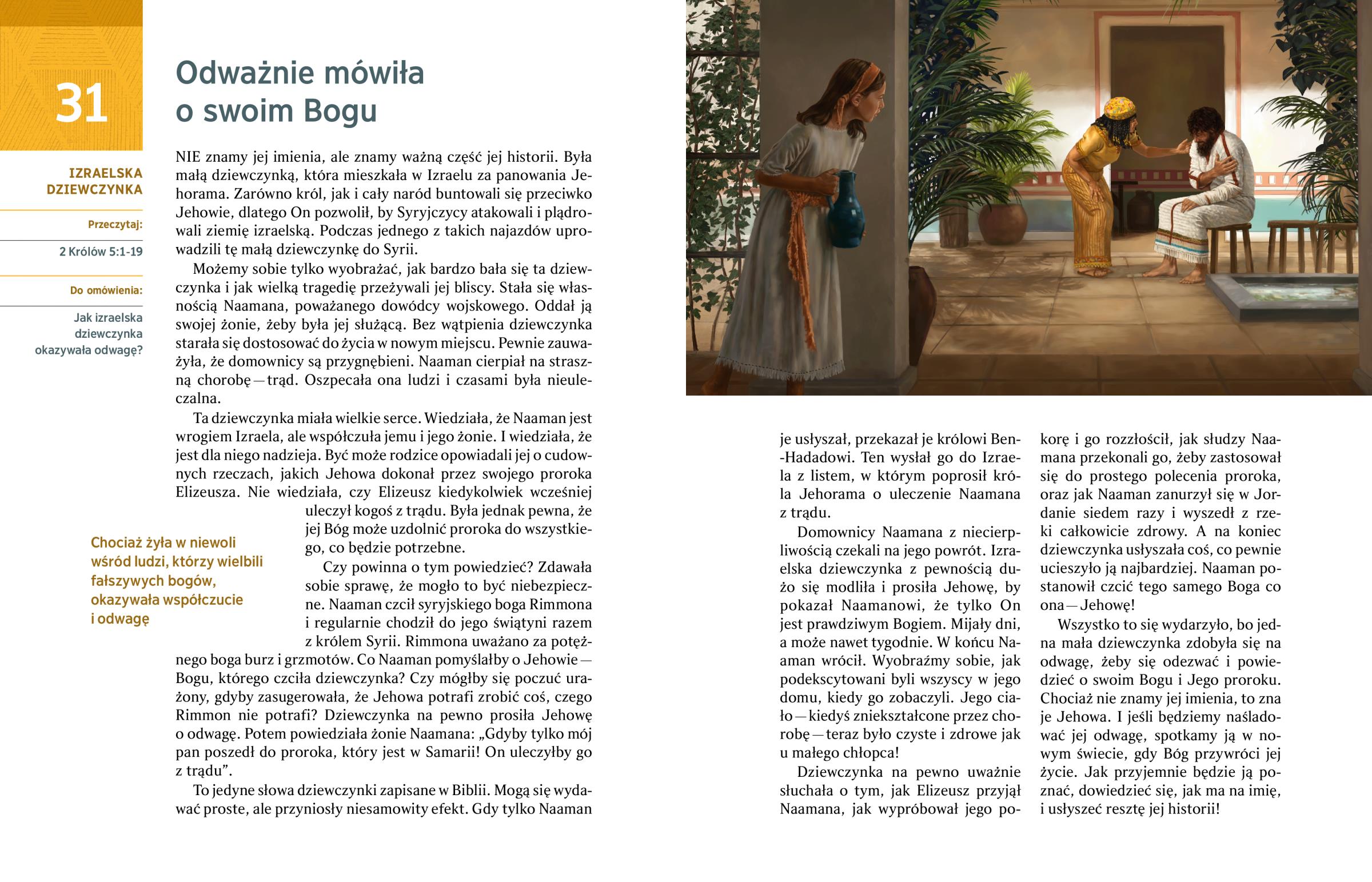 Wszystko to się wydarzyło, bo jedna mała dziewczynka zdobyła się na odwagę, żeby się odezwać i powiedzieć o swoim Bogu i Jego proroku. Chociaż nie znamy jej imienia, to zna je Jehowa. I jeśli będziemy naśladować jej odwagę, spotkamy ją w nowym świecie, gdy Bóg przywróci jej życie. Jak przyjemnie będzie ją poznać, dowiedzieć się, jak ma na imię, i usłyszeć resztę jej historii!