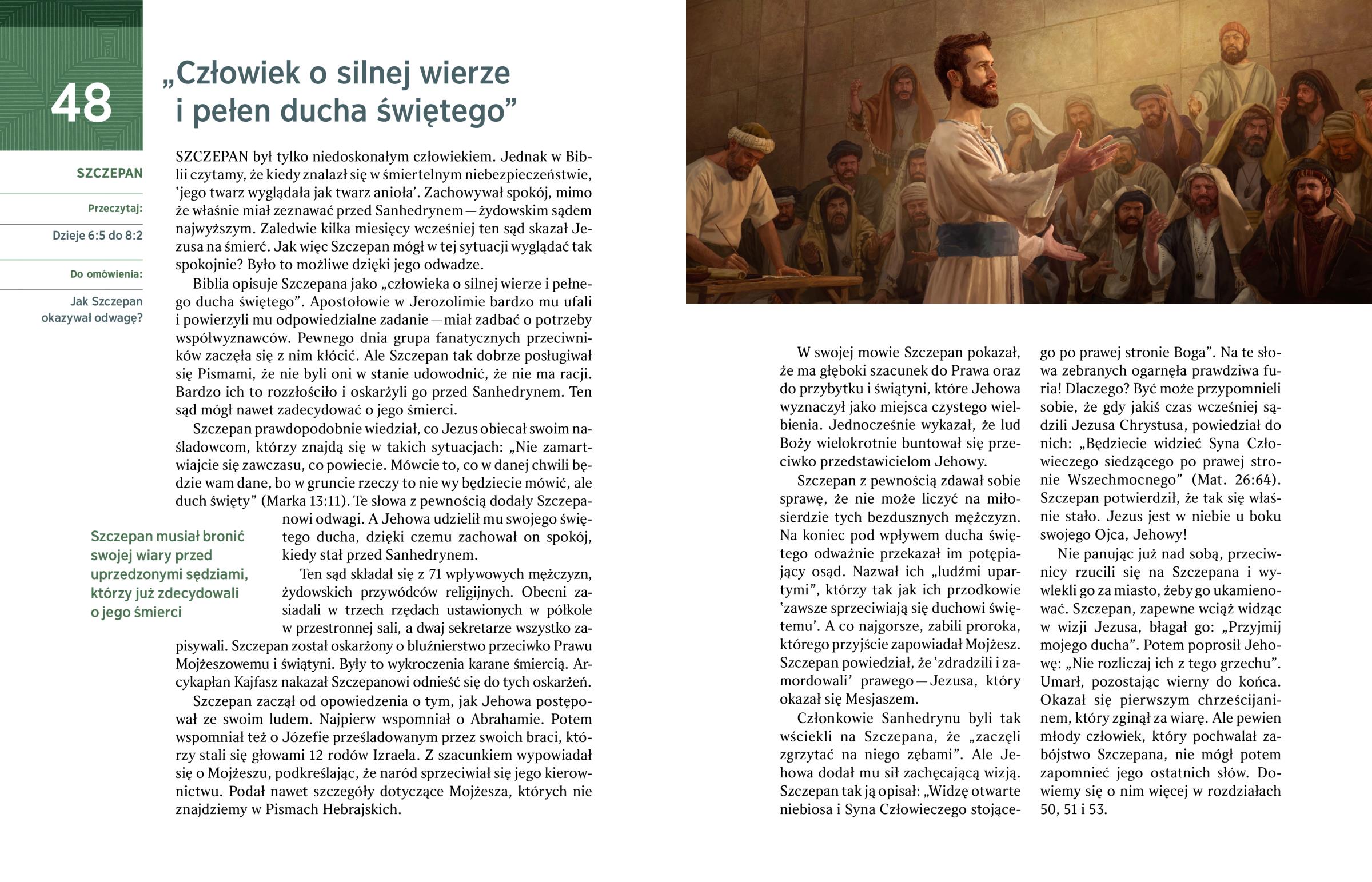 Nie panując już nad sobą, przeciwnicy rzucili się na Szczepana i wywlekli go za miasto, żeby go ukamienować. Szczepan, zapewne wciąż widząc w wizji Jezusa, błagał go: „Przyjmij mojego ducha”. Potem poprosił Jehowę: „Nie rozliczaj ich z tego grzechu”. Umarł, pozostając wierny do końca. Okazał się pierwszym chrześcijaninem, który zginął za wiarę. Ale pewien młody człowiek, który pochwalał zabójstwo Szczepana, nie mógł potem zapomnieć jego ostatnich słów. Dowiemy się o nim więcej w rozdziałach 50, 51 i 53.