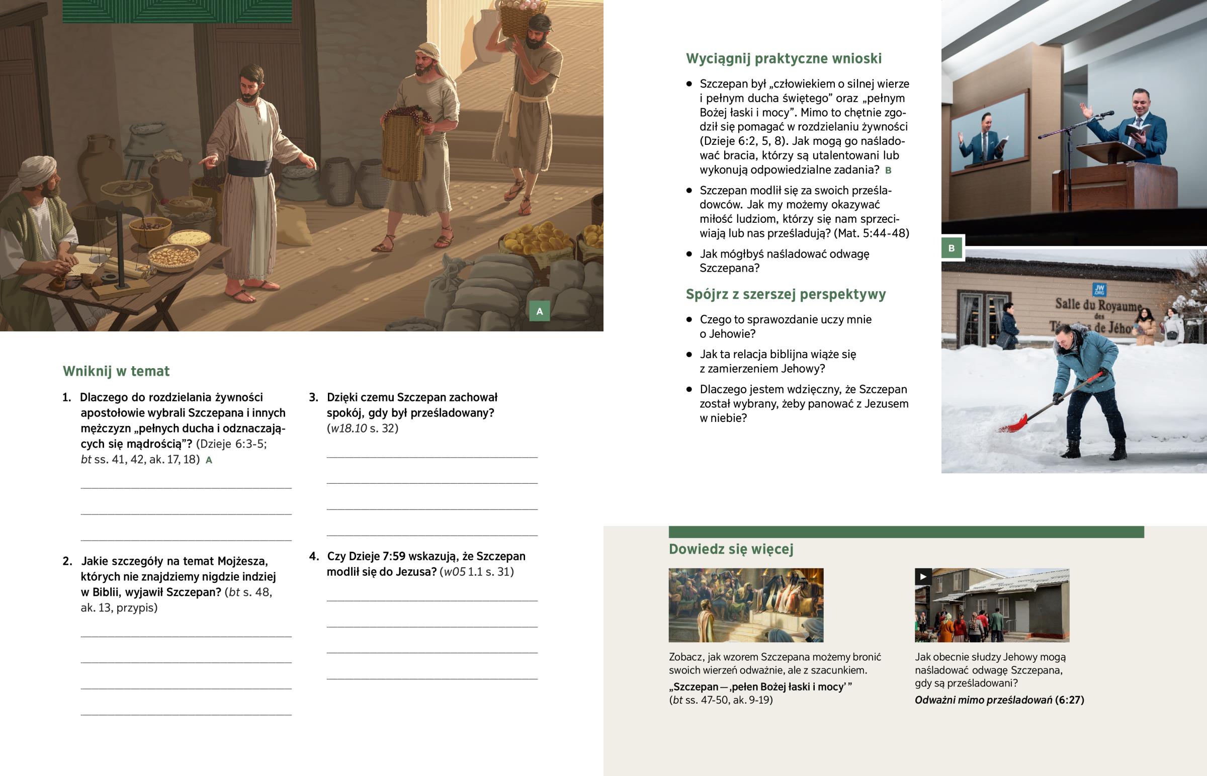 1. Dlaczego do rozdzielania żywności apostołowie wybrali Szczepana i innych mężczyzn „pełnych ducha i odznaczających się mądrością”? (Dzieje 6:3-5; bt ss. 41, 42, ak. 17, 18) A