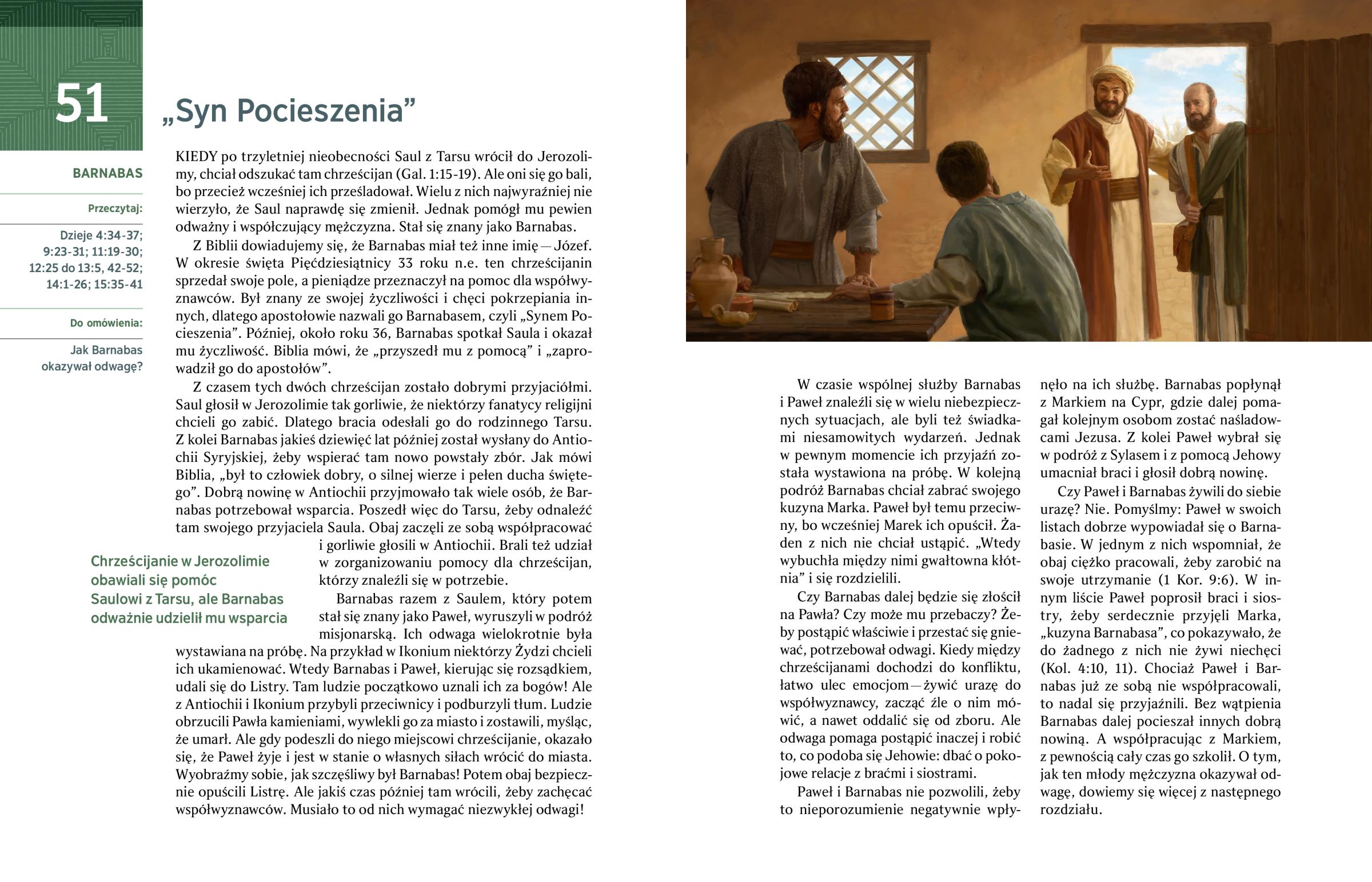 Czy Paweł i Barnabas żywili do siebie urazę? Nie. Pomyślmy: Paweł w swoich listach dobrze wypowiadał się o Barnabasie. W jednym z nich wspomniał, że obaj ciężko pracowali, żeby zarobić na swoje utrzymanie (1 Kor. 9:6). W innym liście Paweł poprosił braci i siostry, żeby serdecznie przyjęli Marka, „kuzyna Barnabasa”, co pokazywało, że do żadnego z nich nie żywi niechęci (Kol. 4:10, 11). Chociaż Paweł i Barnabas już ze sobą nie współpracowali, to nadal się przyjaźnili. Bez wątpienia Barnabas dalej pocieszał innych dobrą nowiną. A współpracując z Markiem, z pewnością cały czas go szkolił. O tym, jak ten młody mężczyzna okazywał odwagę, dowiemy się więcej z następnego rozdziału.