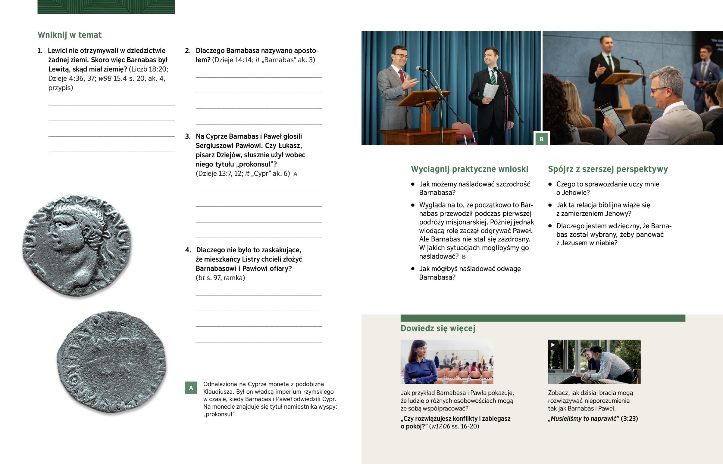 Wygląda na to, że początkowo to Barnabas przewodził podczas pierwszej podróży misjonarskiej. Później jednak wiodącą rolę zaczął odgrywać Paweł. Ale Barnabas nie stał się zazdrosny. W jakich sytuacjach moglibyśmy go naśladować? B