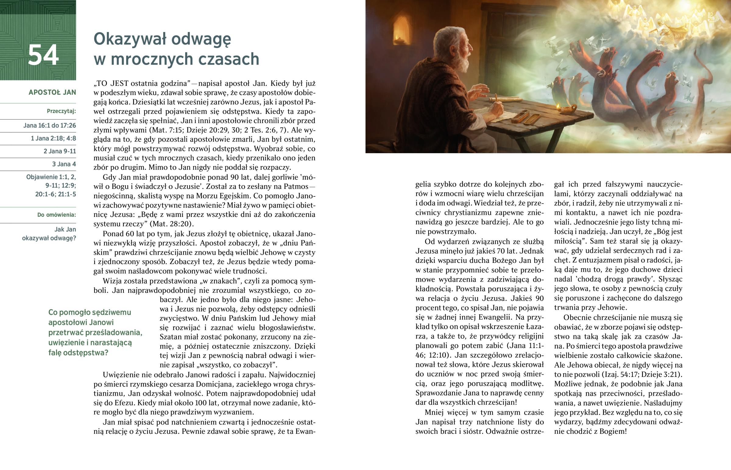 Obecnie chrześcijanie nie muszą się obawiać, że w zborze pojawi się odstępstwo na taką skalę jak za czasów Jana. Po śmierci tego apostoła prawdziwe wielbienie zostało całkowicie skażone. Ale Jehowa obiecał, że nigdy więcej na to nie pozwoli (Izaj. 54:17; Dzieje 3:21). Możliwe jednak, że podobnie jak Jana spotkają nas przeciwności, prześladowania, a nawet uwięzienie. Naśladujmy jego przykład. Bez względu na to, co się wydarzy, bądźmy zdecydowani odważnie chodzić z Bogiem!