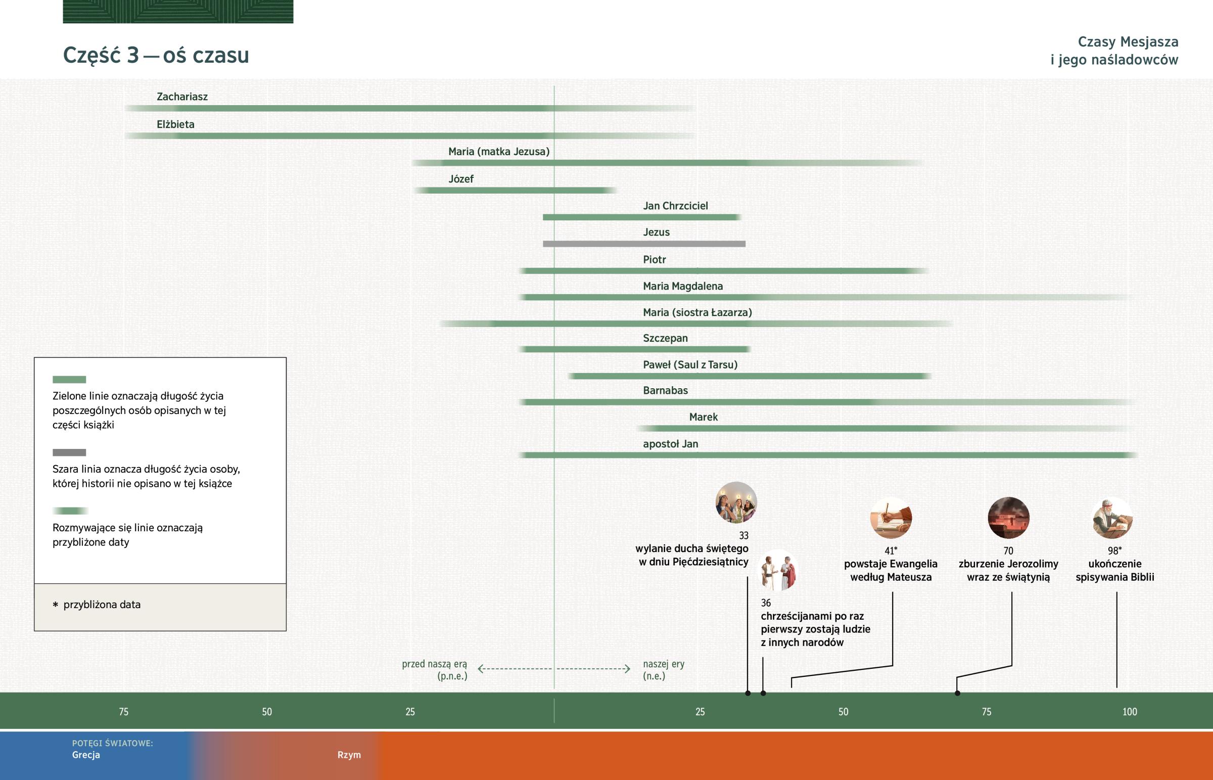 Oś czasu przedstawia długość życia osób opisanych w Części 3 oraz kluczowe wydarzenia biblijne.