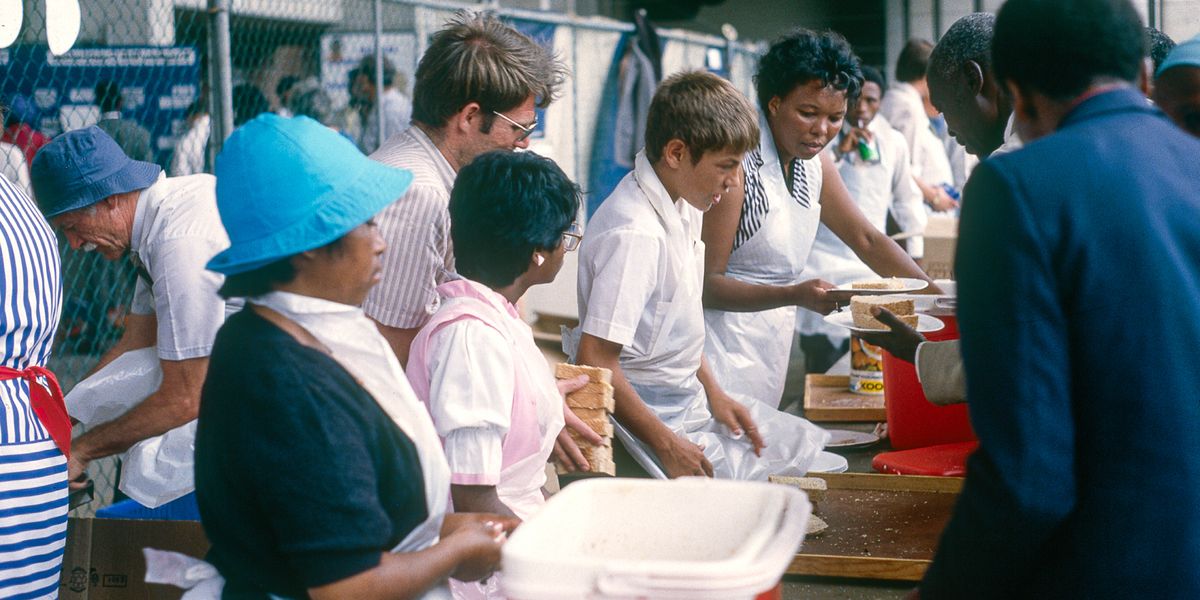 Świadkowie różnych ras serwują posiłki na kongresie, rok 1985
