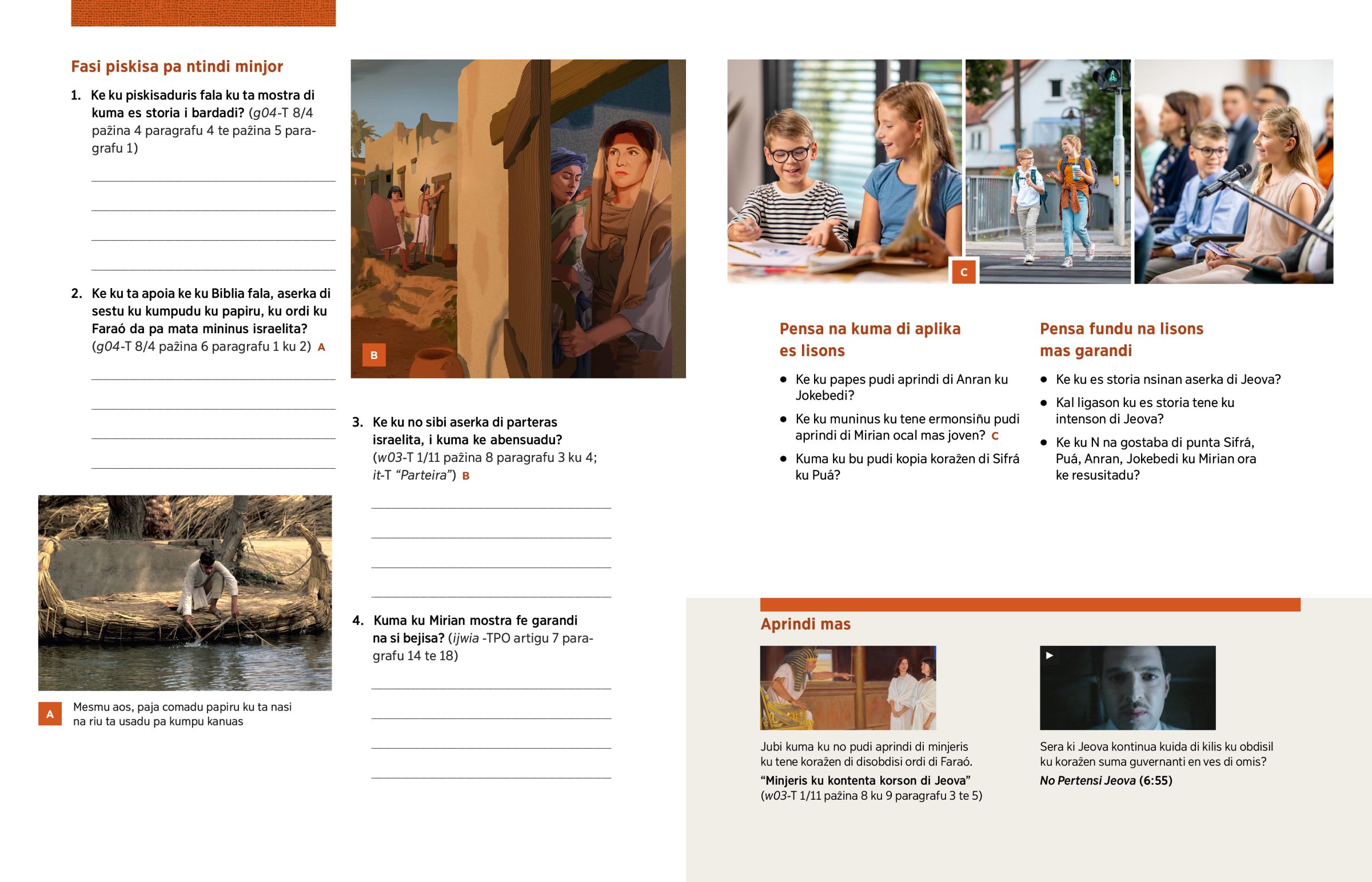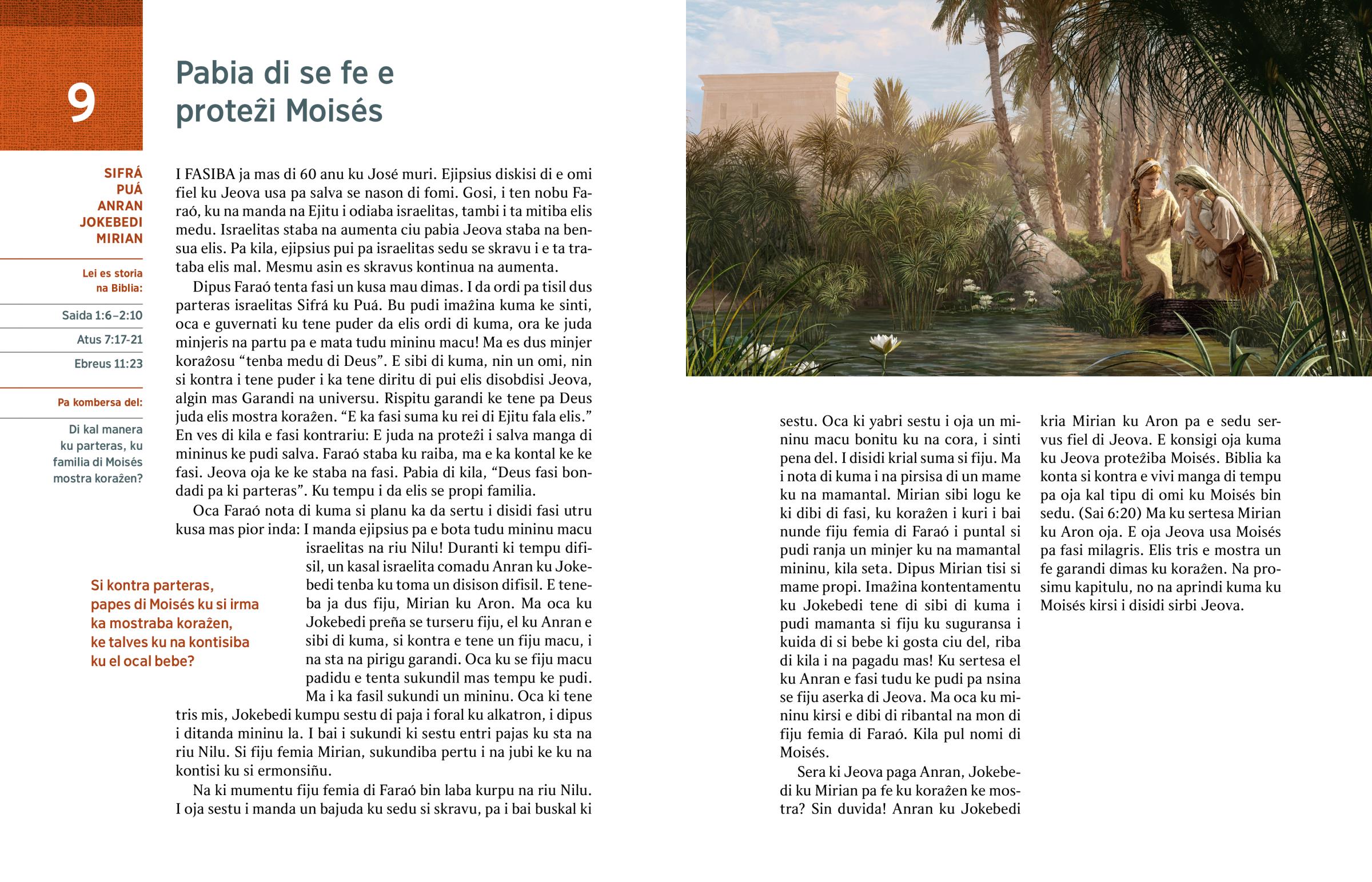 Na ki mumentu fiju femia di Faraó bin laba kurpu na riu Nilu. I oja sestu i manda un bajuda ku sedu si skravu, pa i bai buskal ki sestu. Oca ki yabri sestu i oja un mininu macu bonitu ku na cora, i sinti pena del. I disidi krial suma si fiju. Ma i nota di kuma i na pirsisa di un mame ku na mamantal. Mirian sibi logu ke ki dibi di fasi, ku koraẑen i kuri i bai nunde fiju femia di Faraó i puntal si pudi ranja un minjer ku na mamantal mininu, kila seta. Dipus Mirian tisi si mame propi. Imaẑina kontentamentu ku Jokebedi tene di sibi di kuma i pudi mamanta si fiju ku suguransa i kuida di si bebe ki gosta ciu del, riba di kila i na pagadu mas! Ku sertesa el ku Anran e fasi tudu ke pudi pa nsina se fiju aserka di Jeova. Ma oca ku mininu kirsi e dibi di ribantal na mon di fiju femia di Faraó. Kila pul nomi di Moisés.