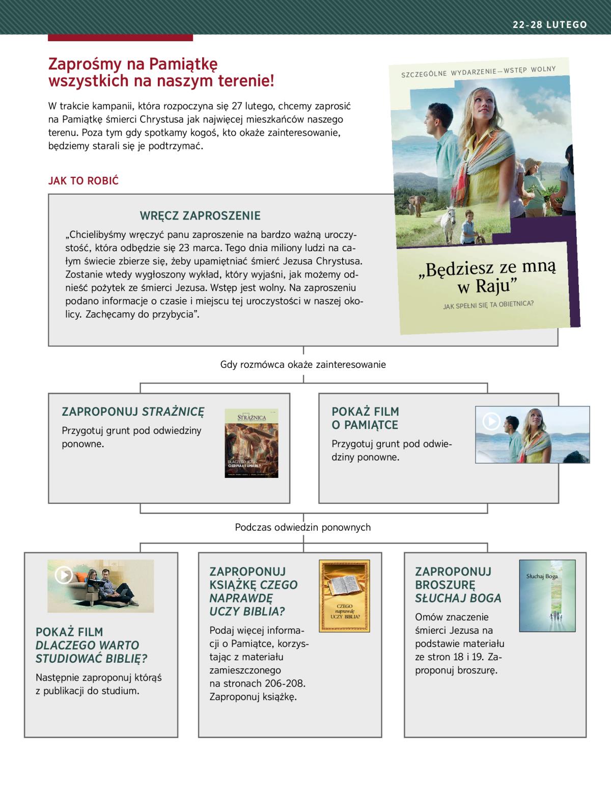 „Chcielibyśmy wręczyć panu zaproszenie na bardzo ważną uroczystość, która odbędzie się 23 marca. Tego dnia miliony ludzi na całym świecie zbierze się, żeby upamiętniać śmierć Jezusa Chrystusa. Zostanie wtedy wygłoszony wykład, który wyjaśni, jak możemy odnieść pożytek ze śmierci Jezusa. Wstęp jest wolny. Na zaproszeniu podano informacje o czasie i miejscu tej uroczystości w naszej okolicy. Zachęcamy do przybycia”.