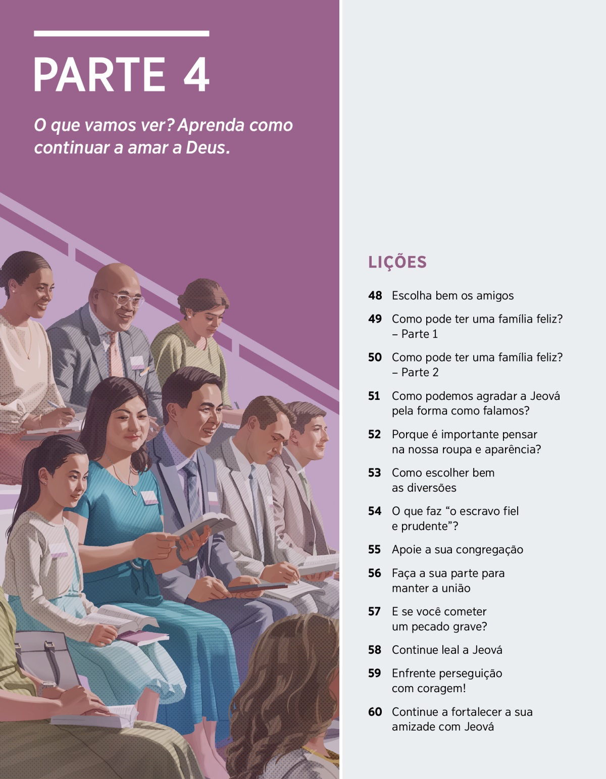 Parte 4 Edição Impressa O que vamos ver? Aprenda como continuar a amar a Deus. LIÇÕES 48 Escolha bem os amigos 49 Como pode ter uma família feliz? – Parte 1 50 Como pode ter uma família feliz? – Parte 2 51 Como podemos agradar a Jeová pela forma como falamos? 52 Porque é importante pensar na nossa roupa e aparência? 53 Como escolher bem as diversões 54 O que faz “o escravo fiel e prudente”? 55 Apoie a sua congregação 56 Faça a sua parte para manter a união 57 E se você cometer um pecado grave? 58 Continue leal a Jeová 59 Enfrente perseguição com coragem! 60 Continue a fortalecer a sua amizade com Jeová