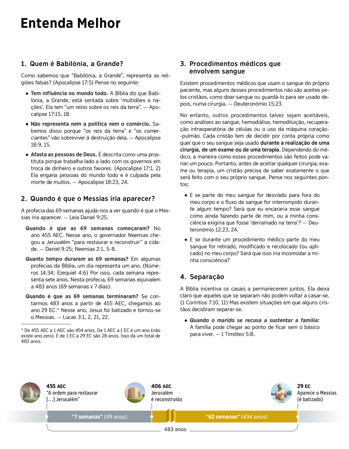Quando é que as 69 semanas terminaram? Se contarmos 483 anos a partir de 455 AEC, chegamos ao ano 29 EC.a Nesse ano, Jesus foi batizado e tornou-se o Messias. — Lucas 3:1, 2, 21, 22.
