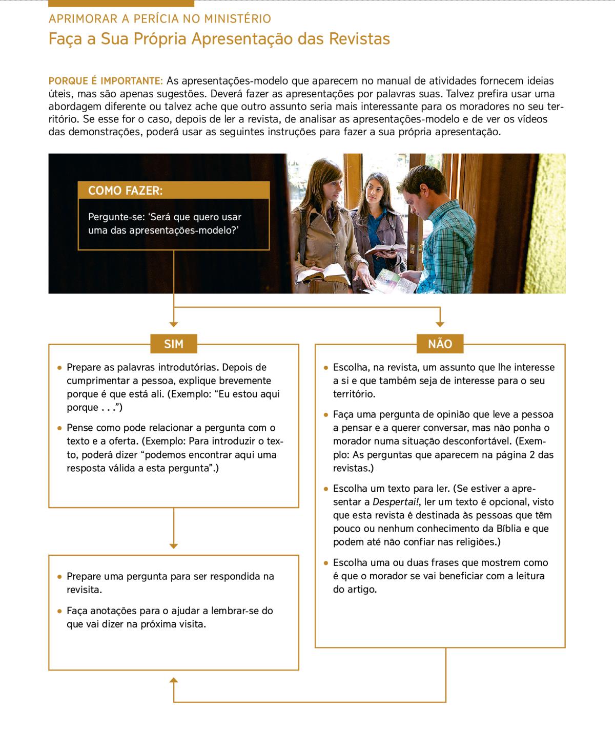PORQUE É IMPORTANTE: As apresentações-modelo que aparecem no manual de atividades fornecem ideias úteis, mas são apenas sugestões. Deverá fazer as apresentações por palavras suas. Talvez prefira usar uma abordagem diferente ou talvez ache que outro assunto seria mais interessante para os moradores no seu território. Se esse for o caso, depois de ler a revista, de analisar as apresentações-modelo e de ver os vídeos das demonstrações, poderá usar as seguintes instruções para fazer a sua própria apresentação.