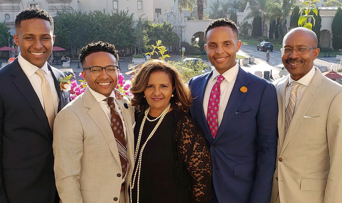 Aster, o seu marido, Wesley, e os seus três filhos, a sorrirem em frente à entrada dos edifícios do Betel de Brooklyn.