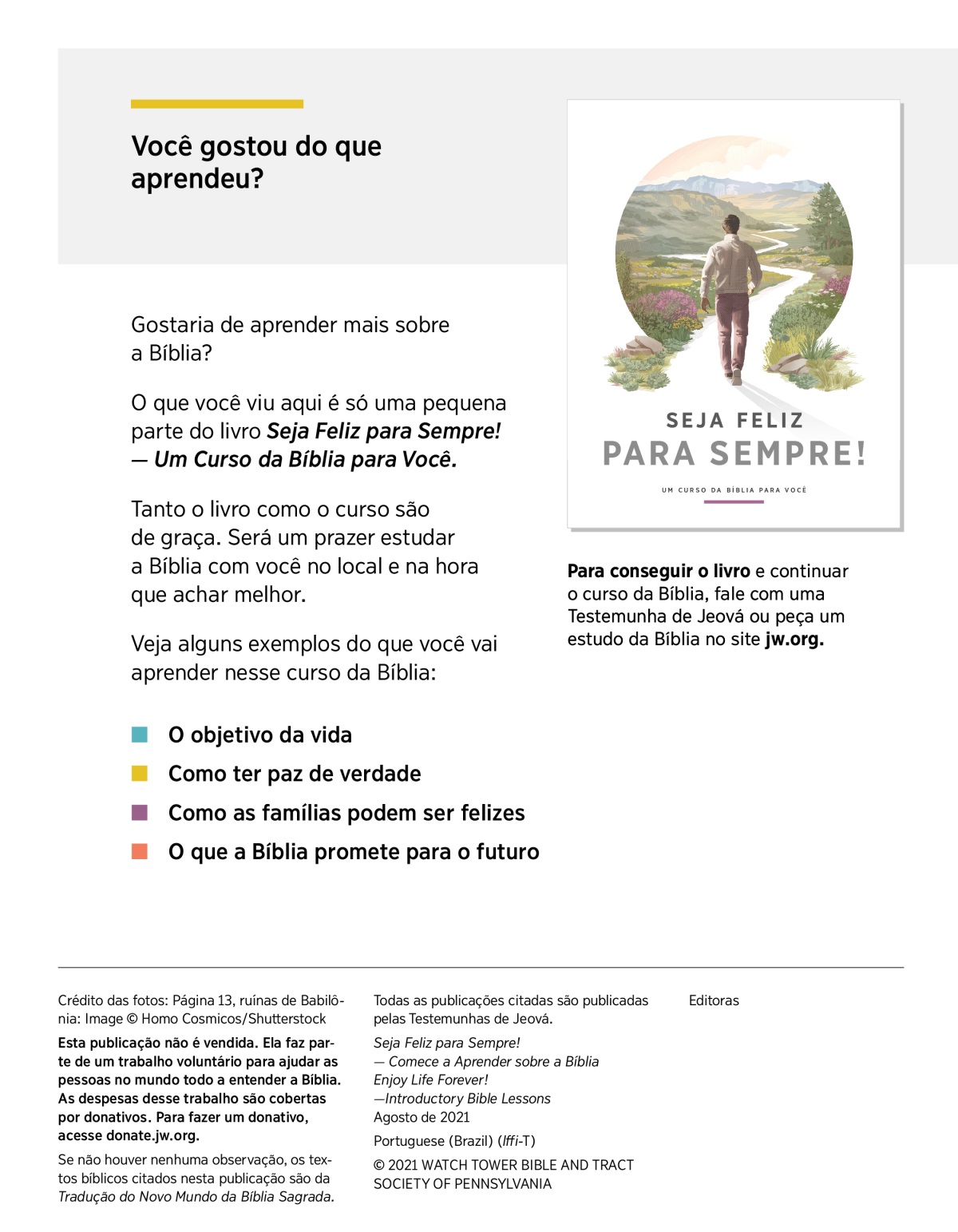 Para conseguir o livro e continuar o curso da Bíblia, fale com uma Testemunha de Jeová ou peça um estudo da Bíblia no site jw.org.