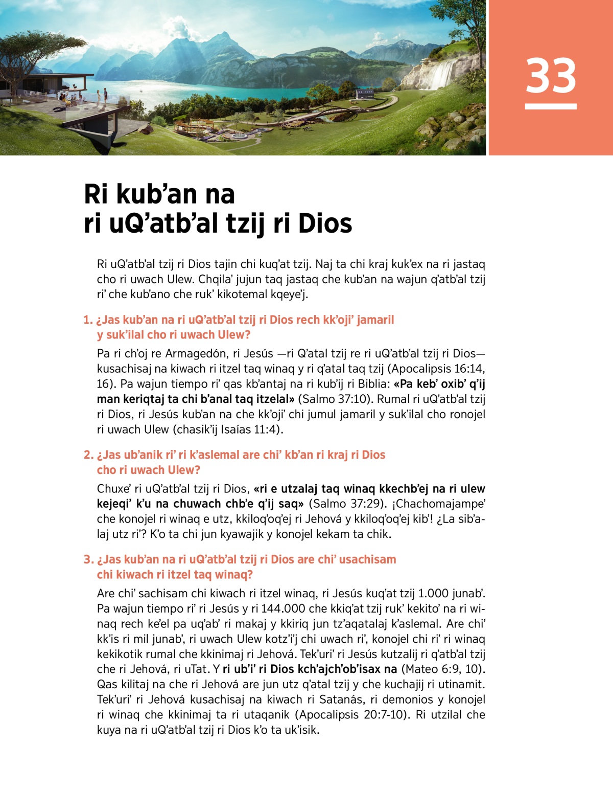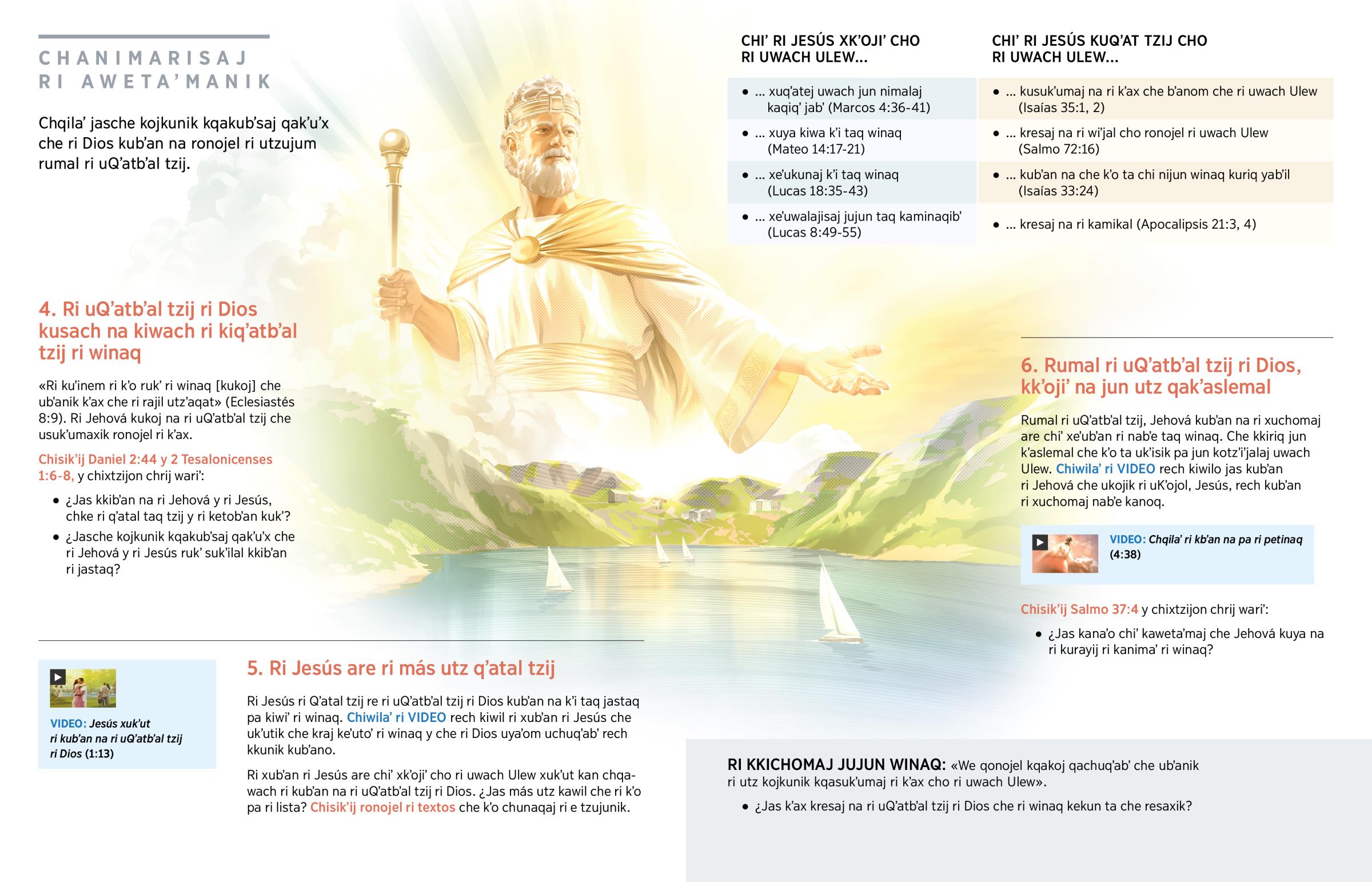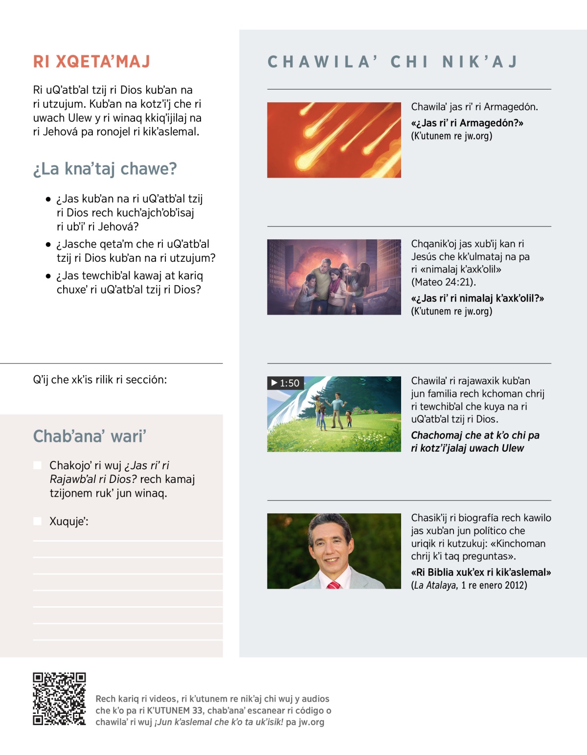 Ri uQʼatbʼal tzij ri Dios kubʼan na ri utzujum. Kubʼan na kotzʼiʼj che ri uwach Ulew y ri winaq kkiqʼijilaj na ri Jehová pa ronojel ri kikʼaslemal.