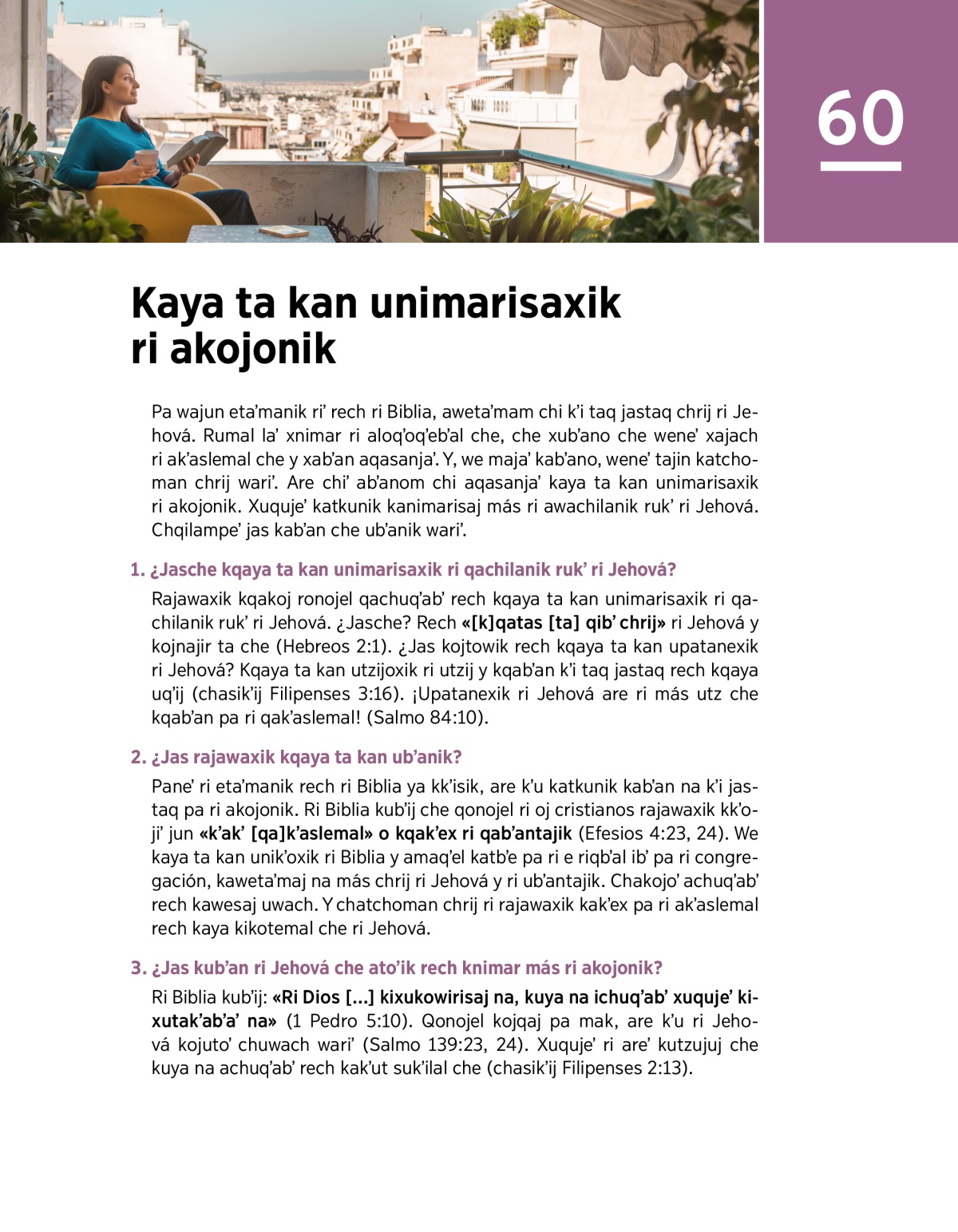 Pa wajun etaʼmanik riʼ rech ri Biblia, awetaʼmam chi kʼi taq jastaq chrij ri Jehová. Rumal laʼ xnimar ri aloqʼoqʼebʼal che, che xubʼano che weneʼ xajach ri akʼaslemal che y xabʼan aqasanjaʼ. Y, we majaʼ kabʼano, weneʼ tajin katchoman chrij wariʼ. Are chiʼ abʼanom chi aqasanjaʼ kaya ta kan unimarisaxik ri akojonik. Xuqujeʼ katkunik kanimarisaj más ri awachilanik rukʼ ri Jehová. Chqilampeʼ jas kabʼan che ubʼanik wariʼ.