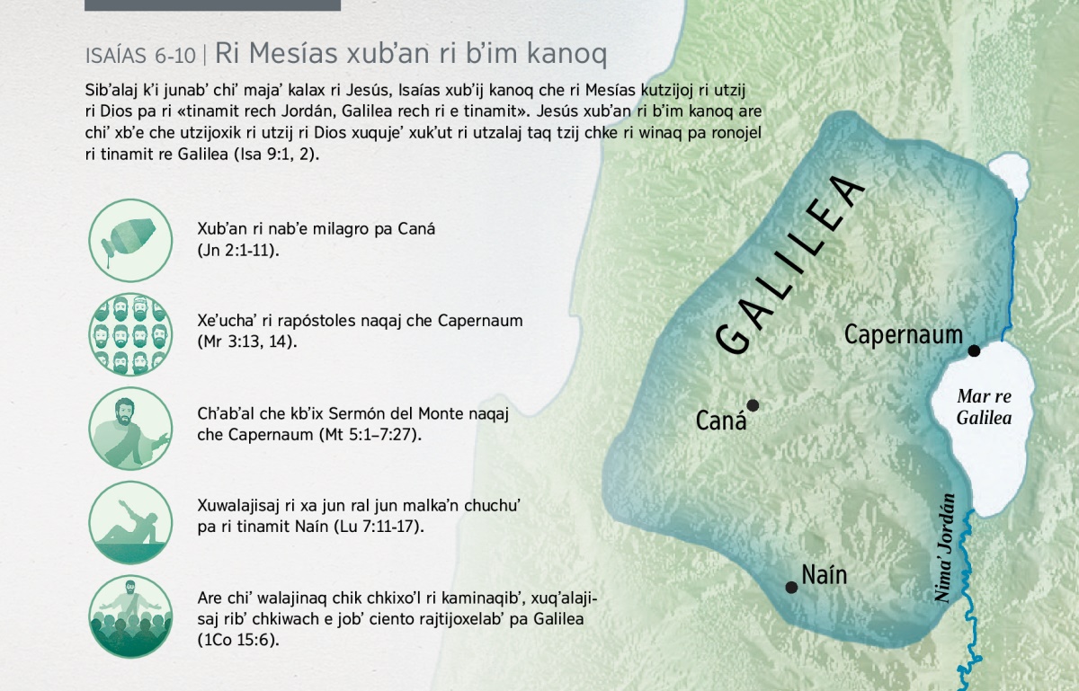 Sibʼalaj kʼi junabʼ chiʼ majaʼ kalax ri Jesús, Isaías xubʼij kanoq che ri Mesías kutzijoj ri utzij ri Dios pa ri «tinamit rech Jordán, Galilea rech ri e tinamit». Jesús xubʼan ri bʼim kanoq are chiʼ xbʼe che utzijoxik ri utzij ri Dios xuqujeʼ xukʼut ri utzalaj taq tzij chke ri winaq pa ronojel ri tinamit re Galilea (Isa 9:1, 2).
