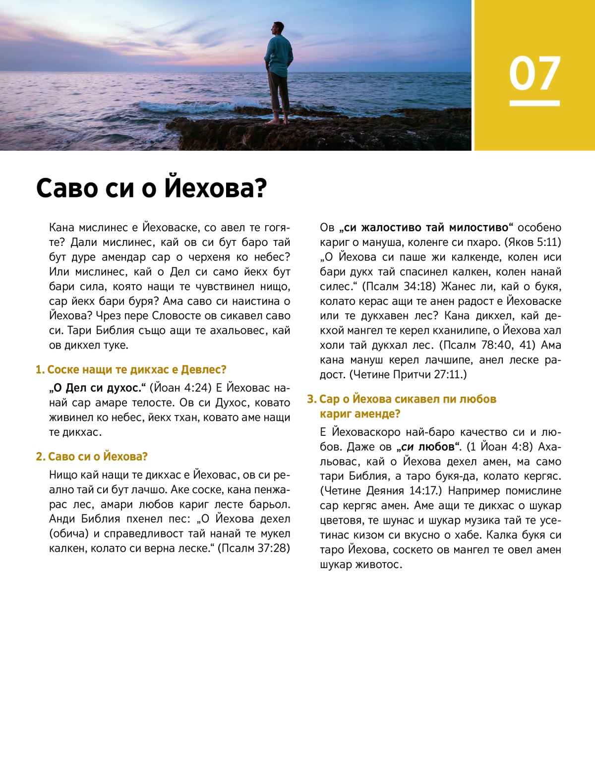 Кана мислинес е Йеховаске, со авел те гогяте? Дали мислинес, кай ов си бут баро тай бут дуре амендар сар о черхеня ко небес? Или мислинес, кай о Дел си само йекх бут бари сила, която нащи те чувствинел нищо, сар йекх бари буря? Ама саво си наистина о Йехова? Чрез пере Словосте ов сикавел саво си. Тари Библия също ащи те ахальовес, кай ов дикхел туке.