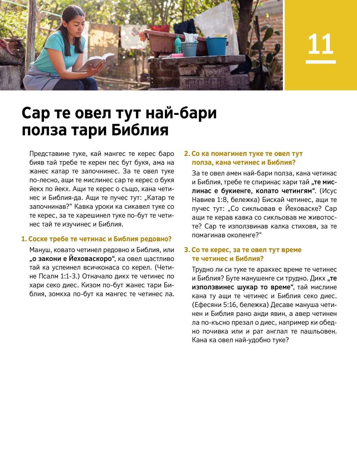За те овел тут най-бари полза тари Библия, мислине кана те четинес ла, молине тут те ахальовес о букя, колато четинес, тай подготвине тут секо дром англал о библейска урокя.