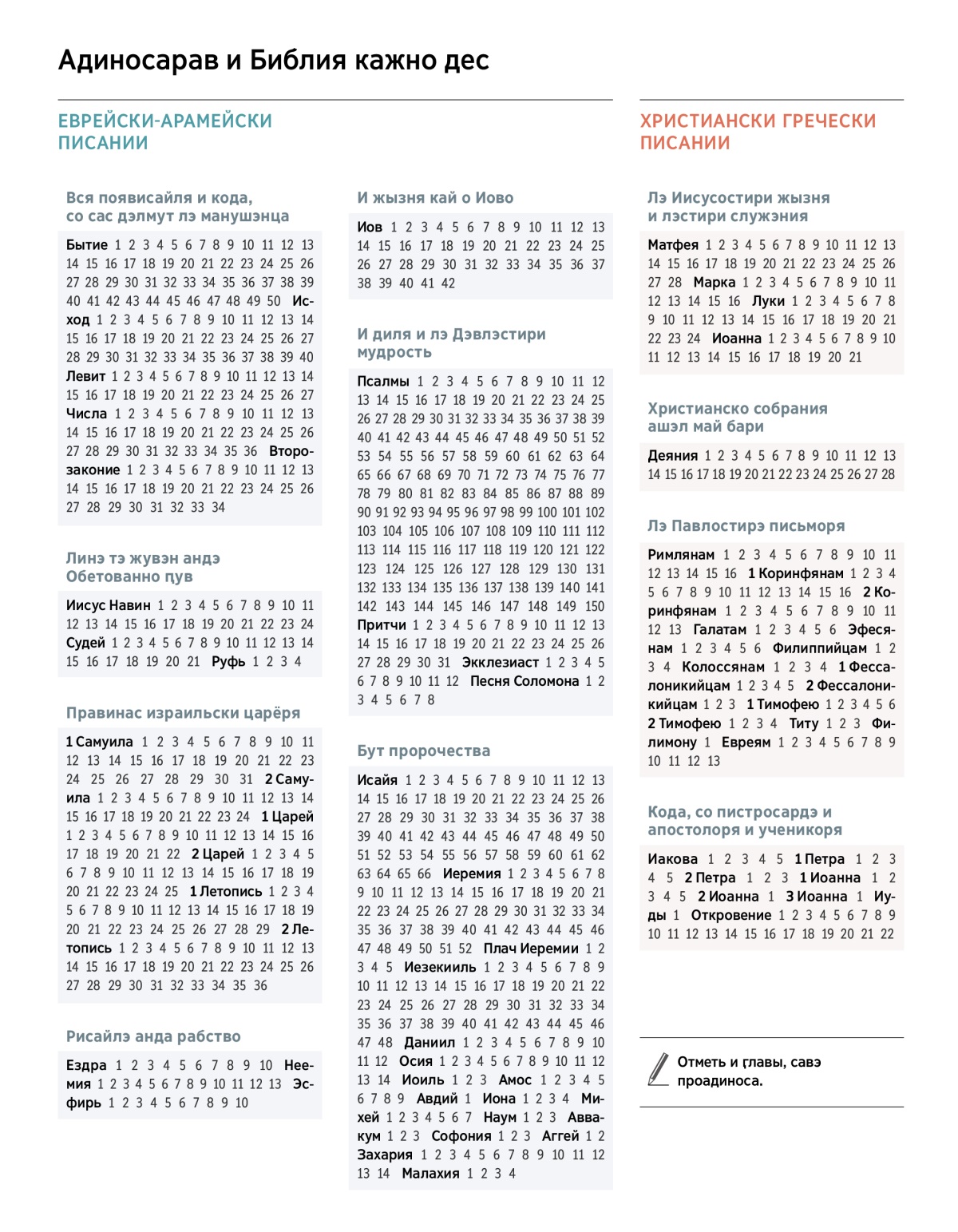Адиносарав и Библия кажно дес Изображэния Вся появисайля и кода, со сас дэлмут лэ манушэнца Линэ тэ жувэн андэ Обетованно ԥув Правинас израильски царёря Рисайлэ анда рабство И жызня кай о Иово И диля и лэ Дэвлэстири мудрость Бут пророчества Лэ Иисусостири жызня и лэстири служэния Христианско собрания ашэл май бари Лэ Павлостирэ письморя Кода, со пистросардэ и апостолоря и ученикоря Отметь и ӷлавы, савэ проадиноса. ЕВРЕЙСКИ-АРАМЕЙСКИ ПИСАНИИ Вся появисайля и кода, со сас дэлмут лэ манушэнца Бытие 1 2 3 4 5 6 7 8 9 10 11 12 13 14 15 16 17 18 19 20 21 22 23 24 25 26 27 28 29 30 31 32 33 34 35 36 37 38 39 40 41 42 43 44 45 46 47 48 49 50 Исход 1 2 3 4 5 6 7 8 9 10 11 12 13 14 15 16 17 18 19 20 21 22 23 24 25 26 27 28 29 30 31 32 33 34 35 36 37 38 39 40 Левит 1 2 3 4 5 6 7 8 9 10 11 12 13 14 15 16 17 18 19 20 21 22 23 24 25 26 27 Числа 1 2 3 4 5 6 7 8 9 10 11 12 13 14 15 16 17 18 19 20 21 22 23 24 25 26 27 28 29 30 31 32 33 34 35 36 Второзаконие 1 2 3 4 5 6 7 8 9 10 11 12 13 14 15 16 17 18 19 20 21 22 23 24 25 26 27 28 29 30 31 32 33 34 Линэ тэ жувэн андэ Обетованно ԥув Иисус Навин 1 2 3 4 5 6 7 8 9 10 11 12 13 14 15 16 17 18 19 20 21 22 23 24 Судей 1 2 3 4 5 6 7 8 9 10 11 12 13 14 15 16 17 18 19 20 21 Руфь 1 2 3 4 Правинас израильски царёря 1 Самуила 1 2 3 4 5 6 7 8 9 10 11 12 13 14 15 16 17 18 19 20 21 22 23 24 25 26 27 28 29 30 31 2 Самуила 1 2 3 4 5 6 7 8 9 10 11 12 13 14 15 16 17 18 19 20 21 22 23 24 1 Царей 1 2 3 4 5 6 7 8 9 10 11 12 13 14 15 16 17 18 19 20 21 22 2 Царей 1 2 3 4 5 6 7 8 9 10 11 12 13 14 15 16 17 18 19 20 21 22 23 24 25 1 Летопись 1 2 3 4 5 6 7 8 9 10 11 12 13 14 15 16 17 18 19 20 21 22 23 24 25 26 27 28 29 2 Летопись 1 2 3 4 5 6 7 8 9 10 11 12 13 14 15 16 17 18 19 20 21 22 23 24 25 26 27 28 29 30 31 32 33 34 35 36 Рисайлэ анда рабство Ездра 1 2 3 4 5 6 7 8 9 10 Неемия 1 2 3 4 5 6 7 8 9 10 11 12 13 Эсфирь 1 2 3 4 5 6 7 8 9 10 И жызня кай о Иово Иов 1 2 3 4 5 6 7 8 9 10 11 12 13 14 15 16 17 18 19 20 21 22 23 24 25 26 27 28 29 30 31 32 33 34 35 36 37 38 39 40 41 42 И диля и лэ Дэвлэстири мудрость Псалмы 1 2 3 4 5 6 7 8 9 10 11 12 13 14 15 16 17 18 19 20 21 22 23 24 25 26 27 28 29 30 31 32 33 34 35 36 37 38 39 40 41 42 43 44 45 46 47 48 49 50 51 52 53 54 55 56 57 58 59 60 61 62 63 64 65 66 67 68 69 70 71 72 73 74 75 76 77 78 79 80 81 82 83 84 85 86 87 88 89 90 91 92 93 94 95 96 97 98 99 100 101 102 103 104 105 106 107 108 109 110 111 112 113 114 115 116 117 118 119 120 121 122 123 124 125 126 127 128 129 130 131 132 133 134 135 136 137 138 139 140 141 142 143 144 145 146 147 148 149 150 Притчи 1 2 3 4 5 6 7 8 9 10 11 12 13 14 15 16 17 18 19 20 21 22 23 24 25 26 27 28 29 30 31 Экклезиаст 1 2 3 4 5 6 7 8 9 10 11 12 Песня Соломона 1 2 3 4 5 6 7 8 Бут пророчества Исайя 1 2 3 4 5 6 7 8 9 10 11 12 13 14 15 16 17 18 19 20 21 22 23 24 25 26 27 28 29 30 31 32 33 34 35 36 37 38 39 40 41 42 43 44 45 46 47 48 49 50 51 52 53 54 55 56 57 58 59 60 61 62 63 64 65 66 Иеремия 1 2 3 4 5 6 7 8 9 10 11 12 13 14 15 16 17 18 19 20 21 22 23 24 25 26 27 28 29 30 31 32 33 34 35 36 37 38 39 40 41 42 43 44 45 46 47 48 49 50 51 52 Плач Иеремии 1 2 3 4 5 Иезекииль 1 2 3 4 5 6 7 8 9 10 11 12 13 14 15 16 17 18 19 20 21 22 23 24 25 26 27 28 29 30 31 32 33 34 35 36 37 38 39 40 41 42 43 44 45 46 47 48 Даниил 1 2 3 4 5 6 7 8 9 10 11 12 Осия 1 2 3 4 5 6 7 8 9 10 11 12 13 14 Иоиль 1 2 3 Амос 1 2 3 4 5 6 7 8 9 Авдий 1 Иона 1 2 3 4 Михей 1 2 3 4 5 6 7 Наум 1 2 3 Аввакум 1 2 3 Софония 1 2 3 Аггей 1 2 Захария 1 2 3 4 5 6 7 8 9 10 11 12 13 14 Малахия 1 2 3 4 ХРИСТИАНСКИ ГРЕЧЕСКИ ПИСАНИИ Лэ Иисусостири жызня и лэстири служэния Матфея 1 2 3 4 5 6 7 8 9 10 11 12 13 14 15 16 17 18 19 20 21 22 23 24 25 26 27 28 Марка 1 2 3 4 5 6 7 8 9 10 11 12 13 14 15 16 Луки 1 2 3 4 5 6 7 8 9 10 11 12 13 14 15 16 17 18 19 20 21 22 23 24 Иоанна 1 2 3 4 5 6 7 8 9 10 11 12 13 14 15 16 17 18 19 20 21 Христианско собрания ашэл май бари Деяния 1 2 3 4 5 6 7 8 9 10 11 12 13 14 15 16 17 18 19 20 21 22 23 24 25 26 27 28 Лэ Павлостирэ письморя Римлянам 1 2 3 4 5 6 7 8 9 10 11 12 13 14 15 16 1 Коринфянам 1 2 3 4 5 6 7 8 9 10 11 12 13 14 15 16 2 Коринфянам 1 2 3 4 5 6 7 8 9 10 11 12 13 Галатам 1 2 3 4 5 6 Эфесянам 1 2 3 4 5 6 Филиппийцам 1 2 3 4 Колоссянам 1 2 3 4 1 Фессалоникийцам 1 2 3 4 5 2 Фессалоникийцам 1 2 3 1 Тимофею 1 2 3 4 5 6 2 Тимофею 1 2 3 4 Титу 1 2 3 Филимону 1 Евреям 1 2 3 4 5 6 7 8 9 10 11 12 13 Кода, со пистросардэ и апостолоря и ученикоря Иакова 1 2 3 4 5 1 Петра 1 2 3 4 5 2 Петра 1 2 3 1 Иоанна 1 2 3 4 5 2 Иоанна 1 3 Иоанна 1 Иуды 1 Откровение 1 2 3 4 5 6 7 8 9 10 11 12 13 14 15 16 17 18 19 20 21 22