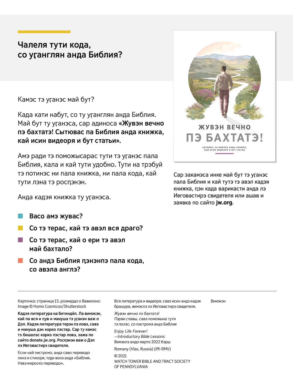 Када кати набут, со ту уӷанглян анда Библия. Май бут ту уӷанэса, сар адиноса «Жувэн вечно пэ бахтатэ! Сытювас па Библия анда книжка, кай исин видеоря и бут статьи».