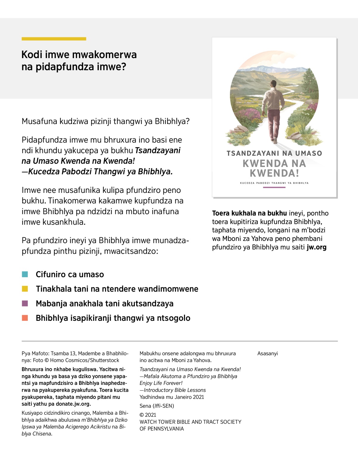 Toera kukhala na bukhu ineyi, pontho toera kupitiriza kupfundza Bhibhlya, taphata miyendo, longani na m’bodzi wa Mboni za Yahova peno phembani pfundziro ya Bhibhlya mu saiti jw.org