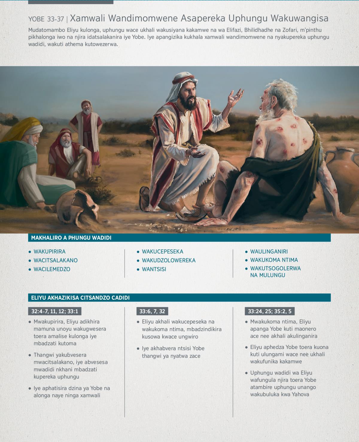 Mudatomambo Eliyu kulonga, uphungu wace ukhali wakusiyana kakamwe na wa Elifazi, Bhilidhadhe na Zofari, m’pinthu pikhalonga iwo na njira idatsalakanira iye Yobe. Iye apangizika kukhala xamwali wandimomwene na nyakupereka uphungu wadidi, wakuti athema kutowezerwa.