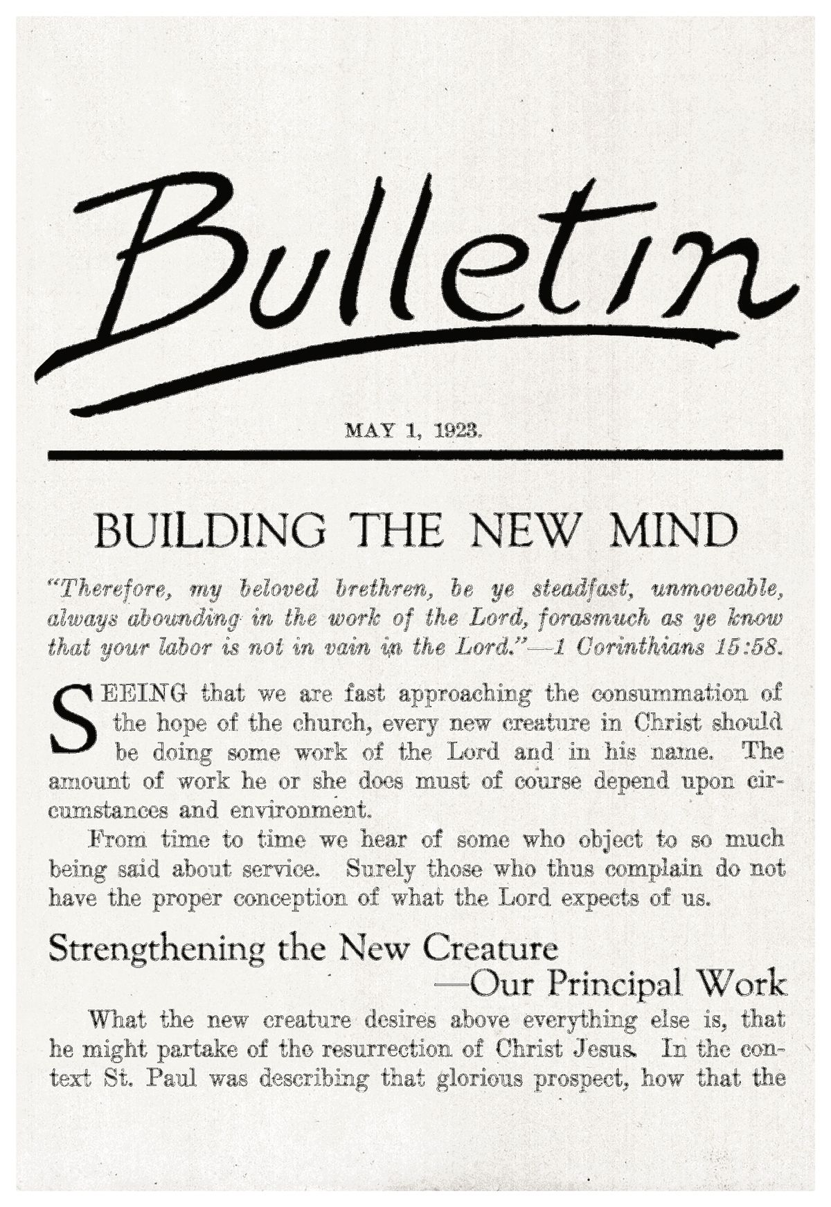 Durante 1923, a organização fez algumas mudanças que ajudaram os Estudantes da Bíblia a ficarem mais unidos na adoração. A Torre de Vigia (agora A Sentinela) começou a publicar explicações dos textos que seriam considerados cada semana durante a Reunião de Oração, Louvor e Testemunho. Também era impresso um calendário que mostrava qual seria o texto a ser considerado na reunião da semana e um hino para cada dia para os irmãos cantarem durante seu estudo pessoal ou em família.