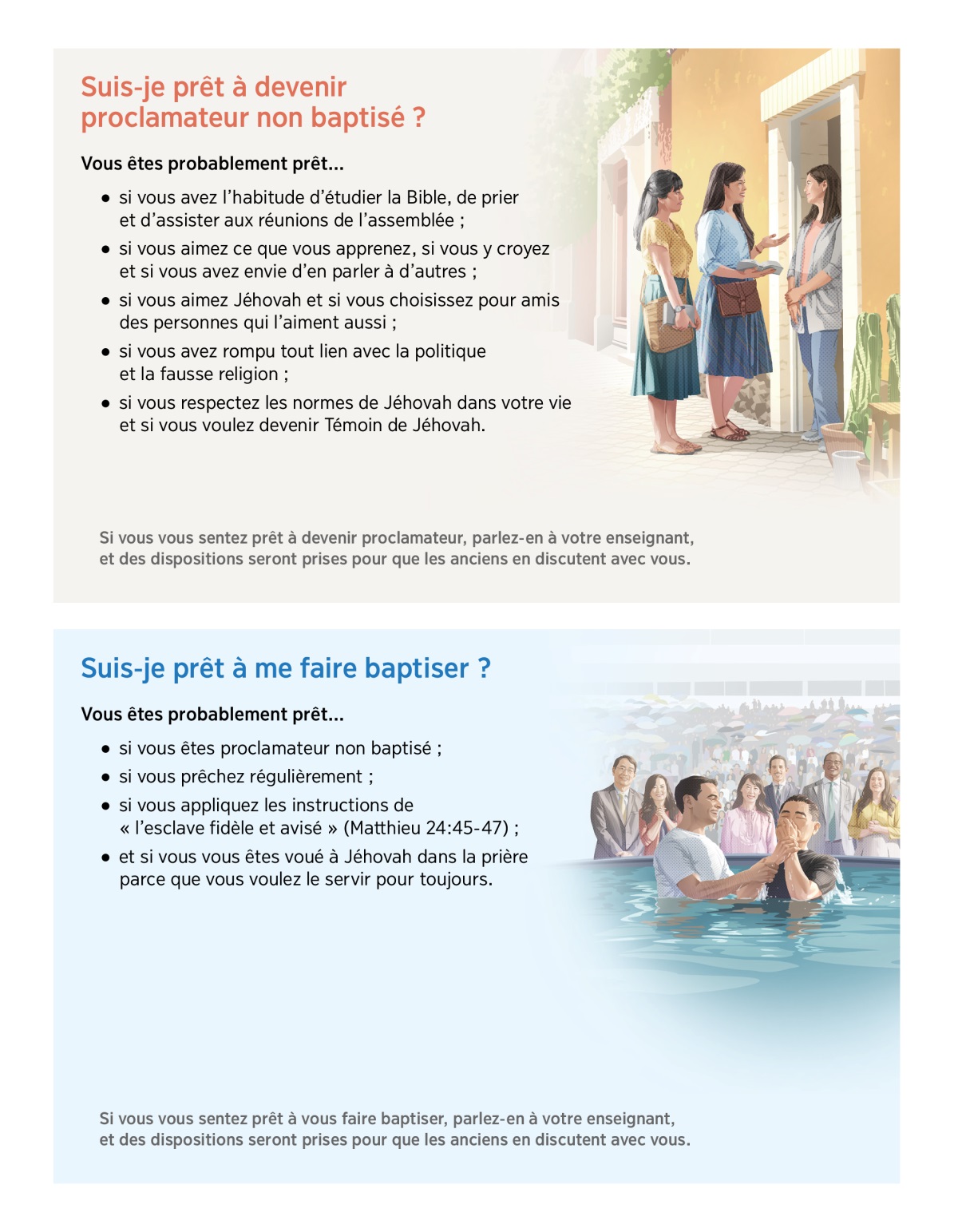 Si vous vous sentez prêt à vous faire baptiser, parlez-en à votre enseignant, et des dispositions seront prises pour que les anciens en discutent avec vous.