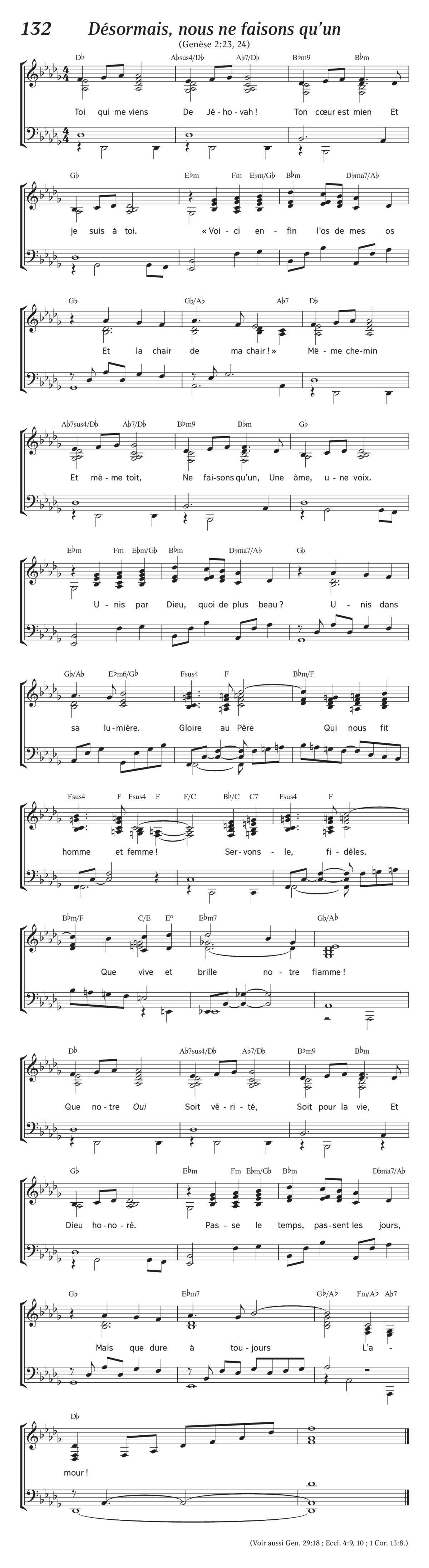 - Toi qui me viens - De Jéhovah ! - Ton cœur est mien - Et je suis à toi. - « Voici enfin l’os de mes os - Et la chair de ma chair ! » - Même chemin - Et même toit, - Ne faisons qu’un, - Une âme, une voix. - Unis par Dieu, quoi de plus beau ? - Unis dans sa lumière. - Gloire au Père - Qui nous fit homme et femme ! - Servons-le, fidèles. - Que vive et brille notre flamme ! - Que notre Oui - Soit vérité, - Soit pour la vie, - Et Dieu honoré. - Passe le temps, passent les jours, - Mais que dure à toujours - L’amour !