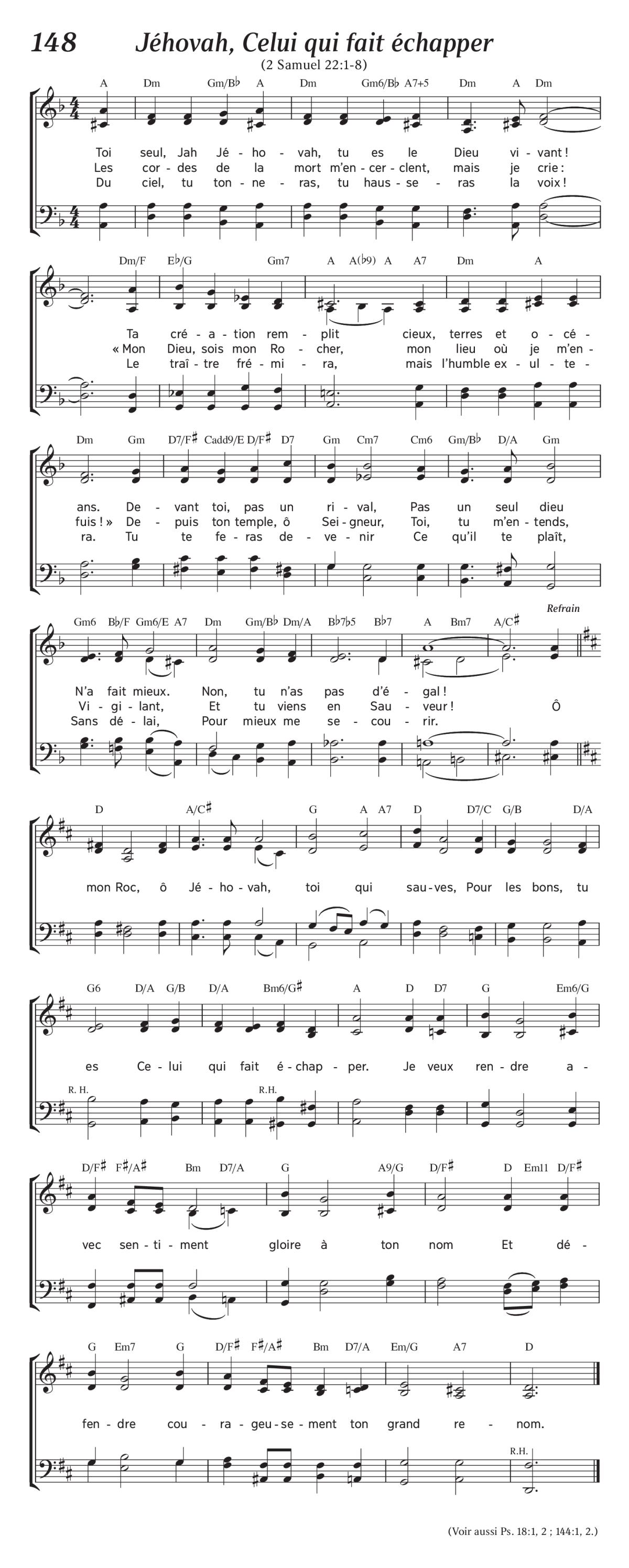 - 2. Les cordes de la mort m’encerclent, mais je crie : - « Mon Dieu, sois mon Rocher, mon lieu où je m’enfuis ! » - Depuis ton temple, ô Seigneur, - Toi, tu m’entends, - Vigilant, - Et tu viens en Sauveur ! - (REFRAIN) - Ô mon Roc, ô Jéhovah, toi qui sauves, - Pour les bons, tu es Celui qui fait échapper. - Je veux rendre avec sentiment gloire à ton nom - Et défendre courageusement ton grand renom.