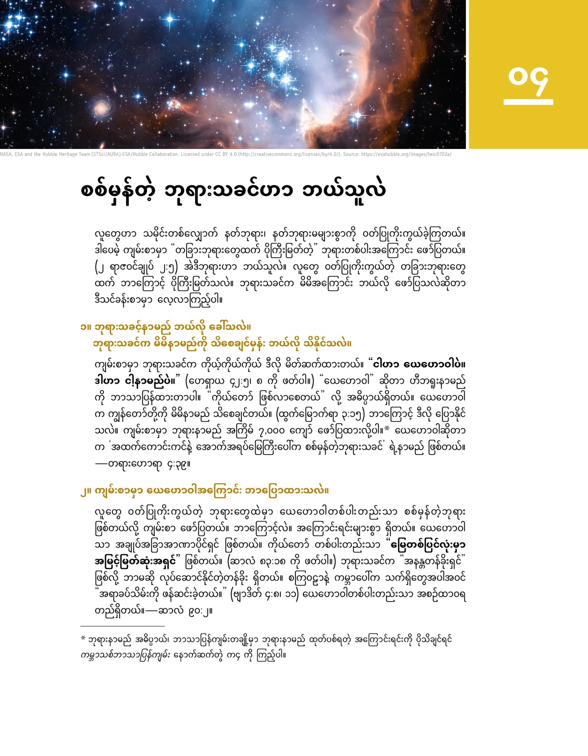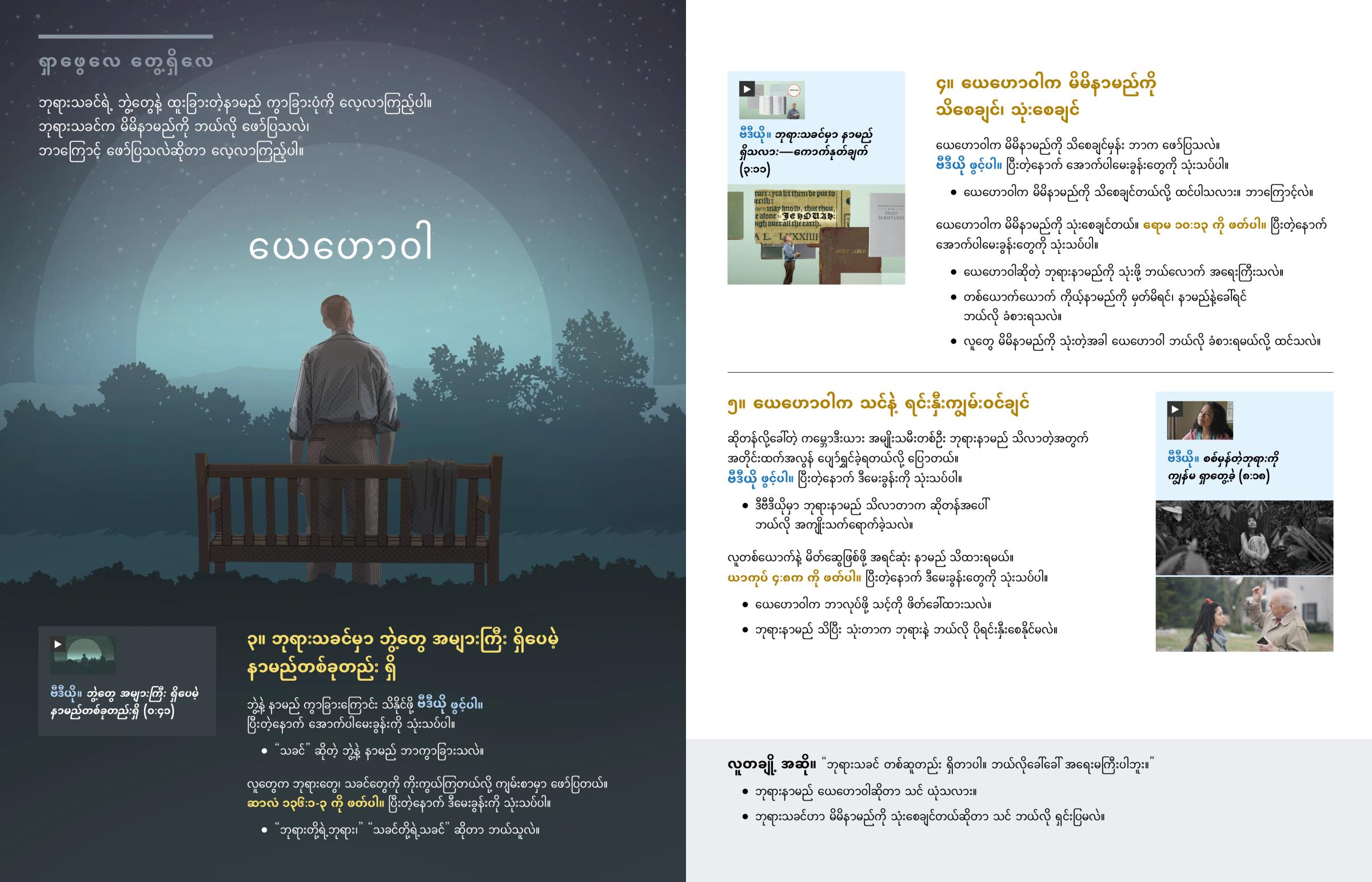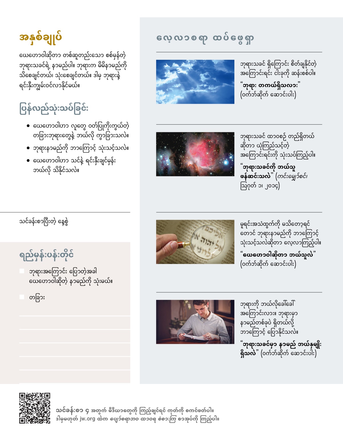 လူတွေဟာ သမိုင်းတစ်လျှောက် နတ်ဘုရား၊ နတ်ဘုရားမများစွာကို ဝတ်ပြုကိုးကွယ်ခဲ့ကြတယ်။ ဒါပေမဲ့ ကျမ်းစာမှာ “တခြားဘုရားတွေထက် ပိုကြီးမြတ်တဲ့” ဘုရားတစ်ပါးအကြောင်း ဖော်ပြတယ်။ (၂ ရာဇဝင်ချုပ် ၂:၅) အဲဒီဘုရားဟာ ဘယ်သူလဲ။ လူတွေ ဝတ်ပြုကိုးကွယ်တဲ့ တခြားဘုရားတွေထက် ဘာကြောင့် ပိုကြီးမြတ်သလဲ။ ဘုရားသခင်က မိမိအကြောင်း ဘယ်လို ဖော်ပြသလဲဆိုတာ ဒီသင်ခန်းစာမှာ လေ့လာကြည့်ပါ။