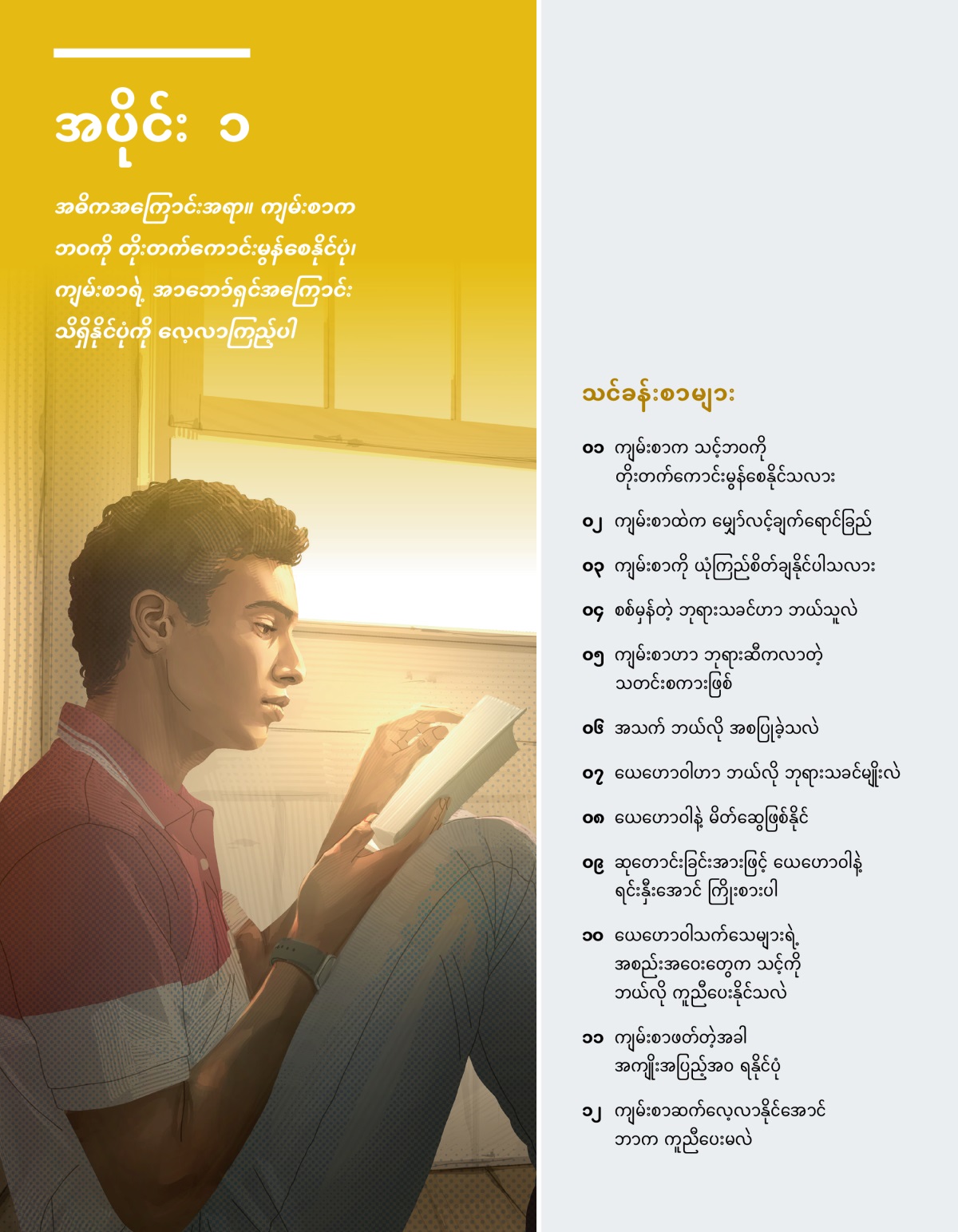 အဓိကအကြောင်း။ ကျမ်းစာက ဘဝကို တိုးတက်ကောင်းမွန်စေနိုင်ပုံ၊ ကျမ်းစာရဲ့ အာဘော်ရှင်အကြောင်း သိရှိနိုင်ပုံကို လေ့လာကြည့်ပါ