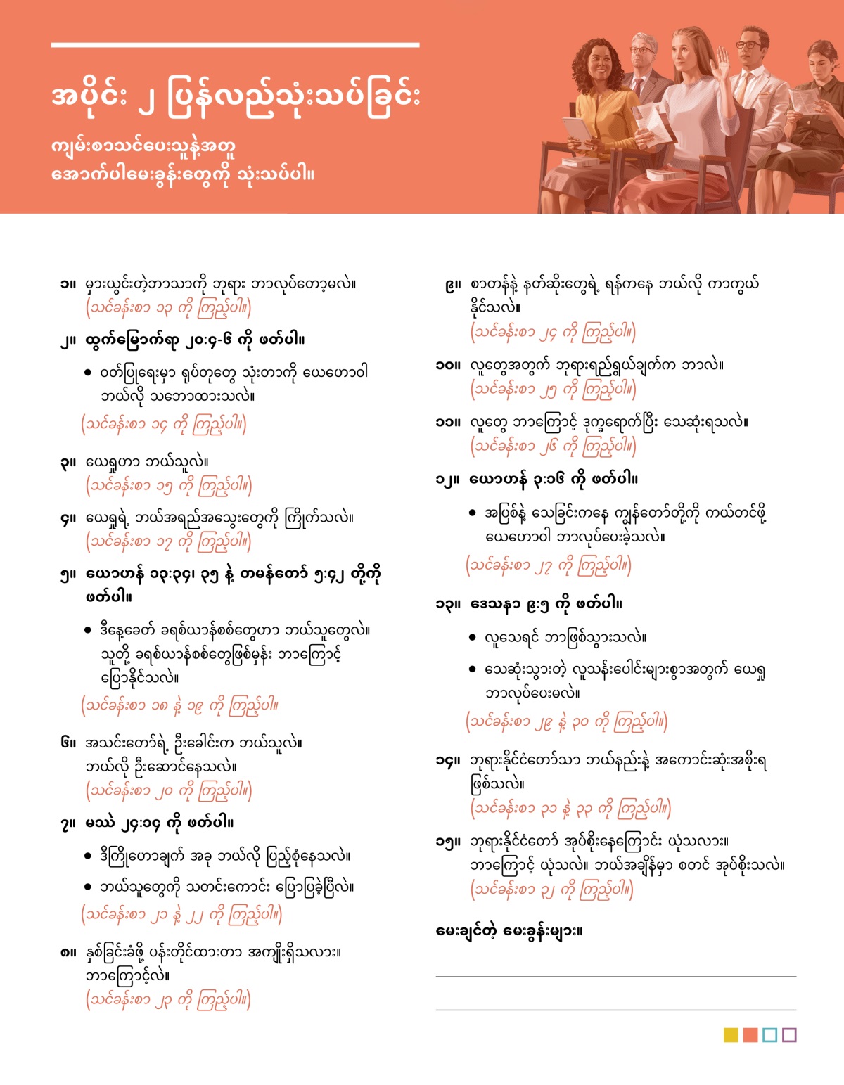 ကျမ်းစာသင်ပေးသူနဲ့အတူ အောက်ပါမေးခွန်းတွေကို သုံးသပ်ပါ။