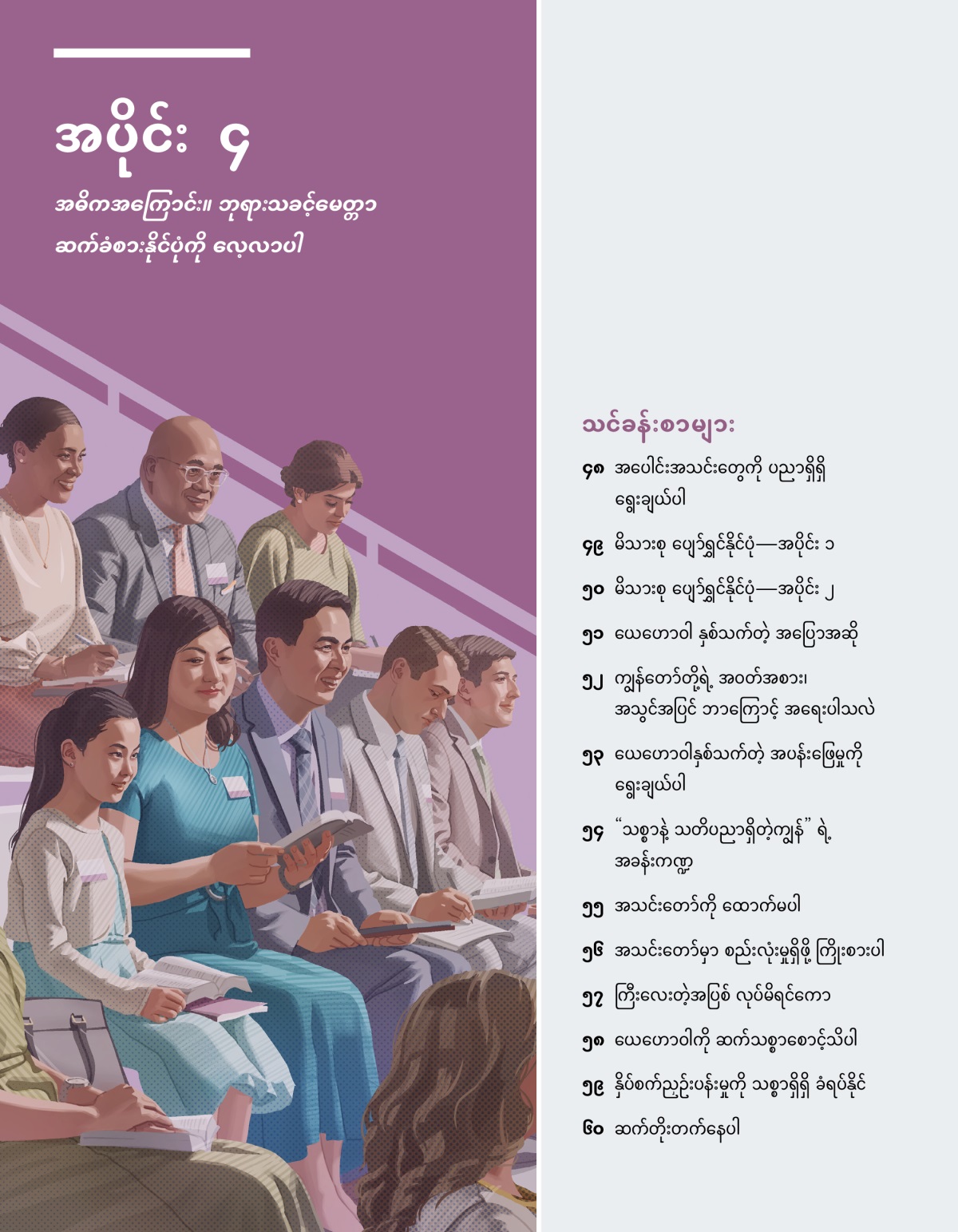 အပိုင်း ၄ ပုံနှိပ်စာပေ အဓိကအကြောင်း။ ဘုရားသခင့်မေတ္တာ ဆက်ခံစားနိုင်ပုံကို လေ့လာပါ သင်ခန်းစာများ ၄၈ အပေါင်းအသင်းတွေကို ပညာရှိရှိ ရွေးချယ်ပါ ၄၉ မိသားစု ပျော်ရွှင်နိုင်ပုံ—အပိုင်း ၁ ၅၀ မိသားစု ပျော်ရွှင်နိုင်ပုံ—အပိုင်း ၂ ၅၁ ယေဟောဝါ နှစ်သက်တဲ့ အပြောအဆို ၅၂ ကျွန်တော်တို့ရဲ့ အဝတ်အစား၊ အသွင်အပြင် ဘာကြောင့် အရေးပါသလဲ ၅၃ ယေဟောဝါနှစ်သက်တဲ့ အပန်းဖြေမှုကို ရွေးချယ်ပါ ၅၄ “သစ္စာနဲ့ သတိပညာရှိတဲ့ကျွန်” ရဲ့ အခန်းကဏ္ဍ ၅၅ အသင်းတော်ကို ထောက်မပါ ၅၆ အသင်းတော်မှာ စည်းလုံးမှုရှိဖို့ ကြိုးစားပါ ၅၇ ကြီးလေးတဲ့အပြစ် လုပ်မိရင်ကော ၅၈ ယေဟောဝါကို ဆက်သစ္စာစောင့်သိပါ ၅၉ နှိပ်စက်ညှဉ်းပန်းမှုကို သစ္စာရှိရှိ ခံရပ်နိုင် ၆၀ ဆက်တိုးတက်နေပါ