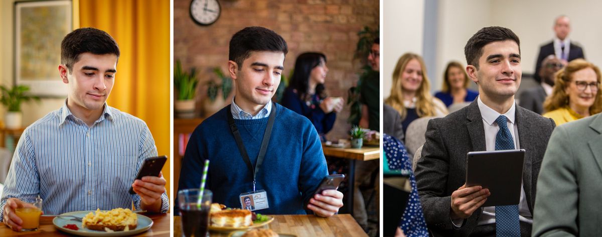 c ပုံအညွှန်း– ညီအစ်ကိုတစ်ယောက် နံနက်ခင်းမှာ နေ့စဉ်ကျမ်းချက် ဖတ်နေ၊ နေ့လယ်နားချိန်မှာ ကျမ်းစာ ဖတ်နေ၊ ညနေခင်းမှာ ကြားရက် အစည်းအဝေး တက်နေ။