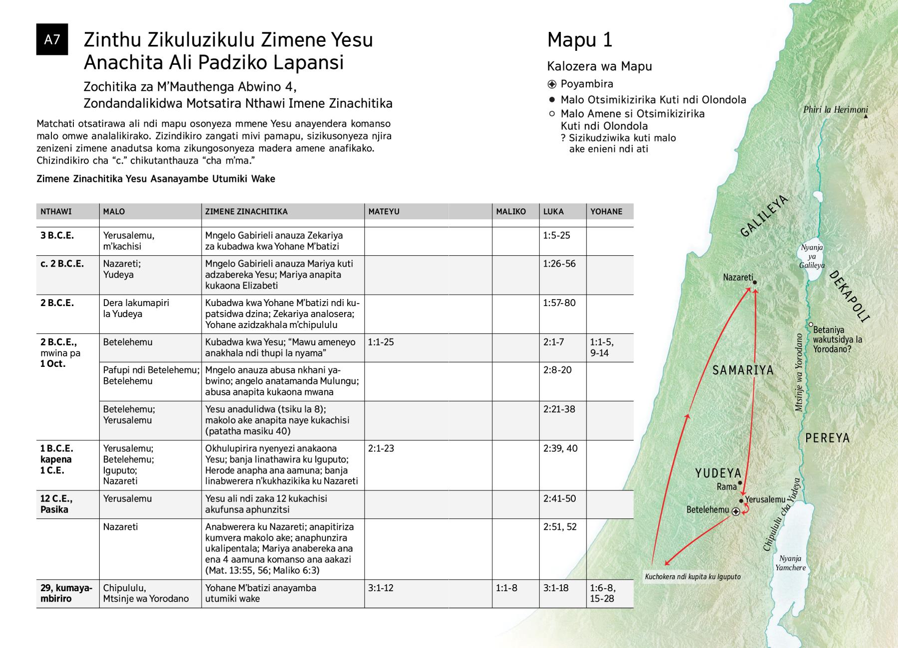 Matchati otsatirawa ali ndi mapu osonyeza mmene Yesu anayendera komanso malo omwe analalikirako. Zizindikiro zangati mivi pamapu, sizikusonyeza njira zenizeni zimene anadutsa koma zikungosonyeza madera amene anafikako. Chizindikiro cha “c.” chikutanthauza “cha mʼma.”