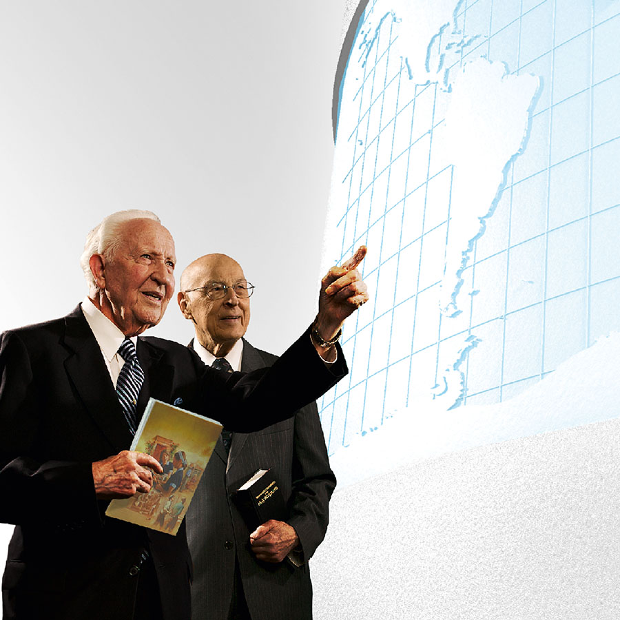 Masamba 2, 3 M’bale J. E. Barr ndi M’bale T. Jaracz a m’Bungwe Lolamulira, akuyang’ana mapu a dziko lapansi.