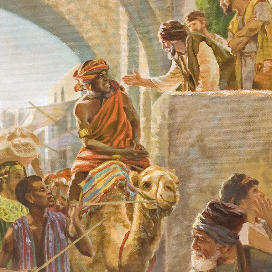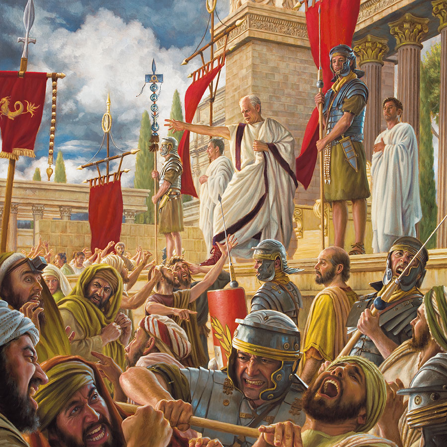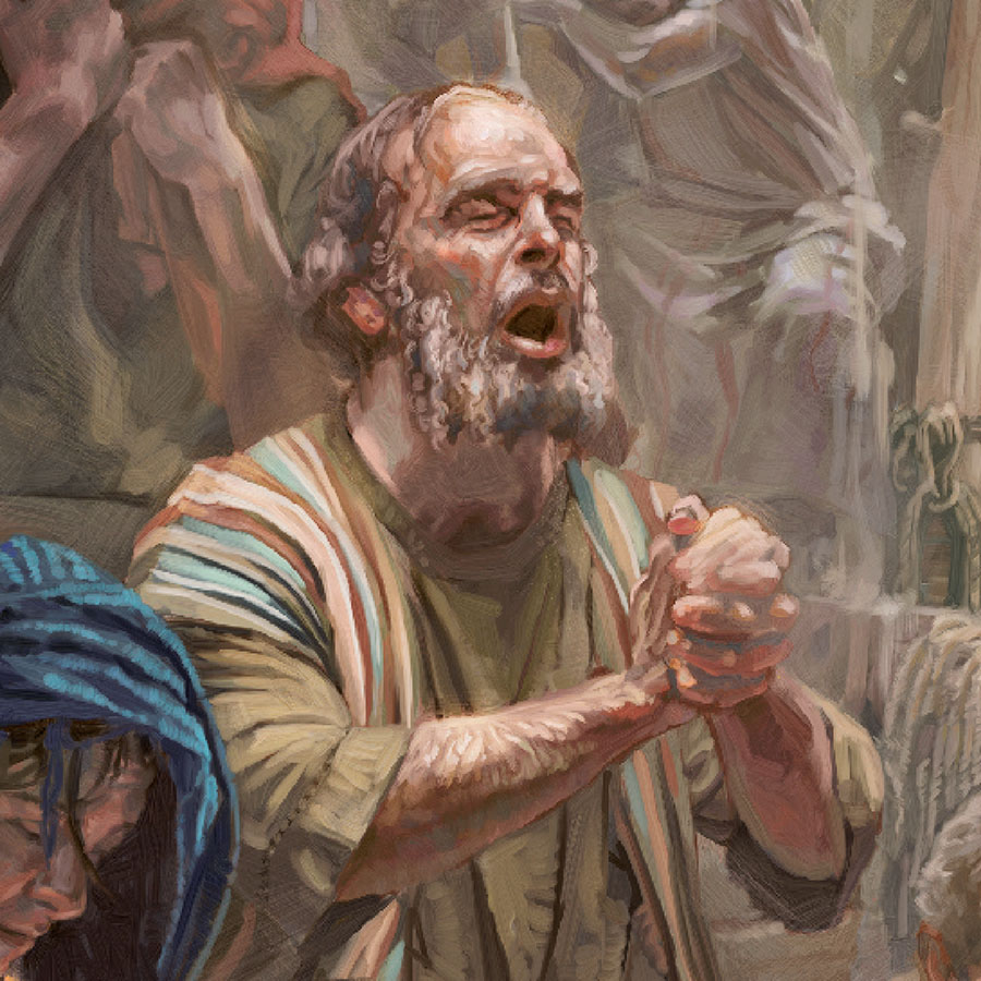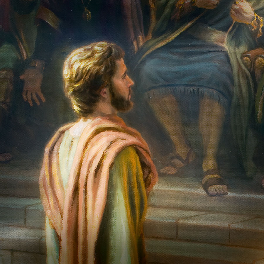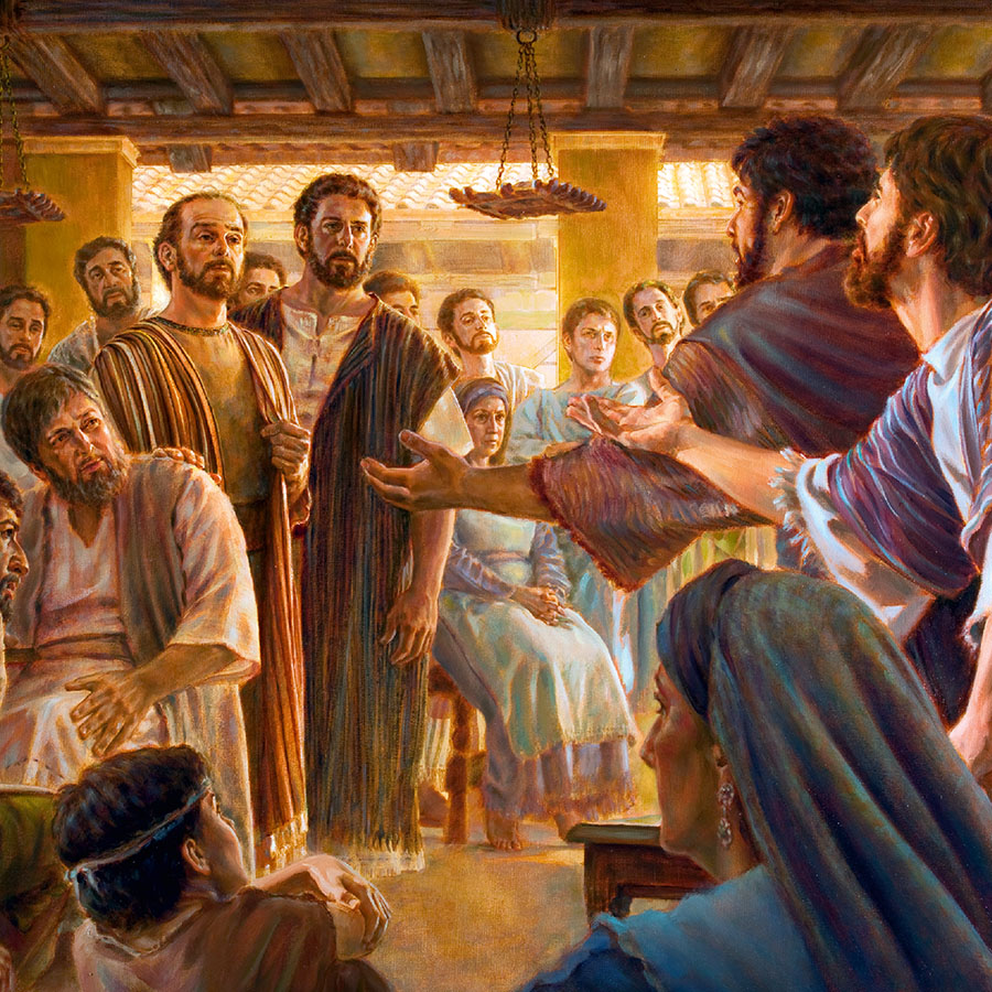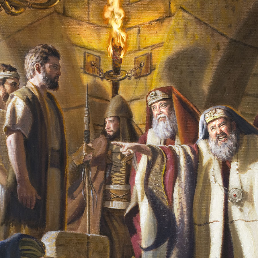 Tsamba 46 Sitefano akuimbidwa mlandu m’Khoti Lalikulu la Ayuda. Asaduki olemera ali chakumbuyo ndipo Afarisi otsatira miyambo ya chipembedzo chawo monyanyira ali kutsogolo.