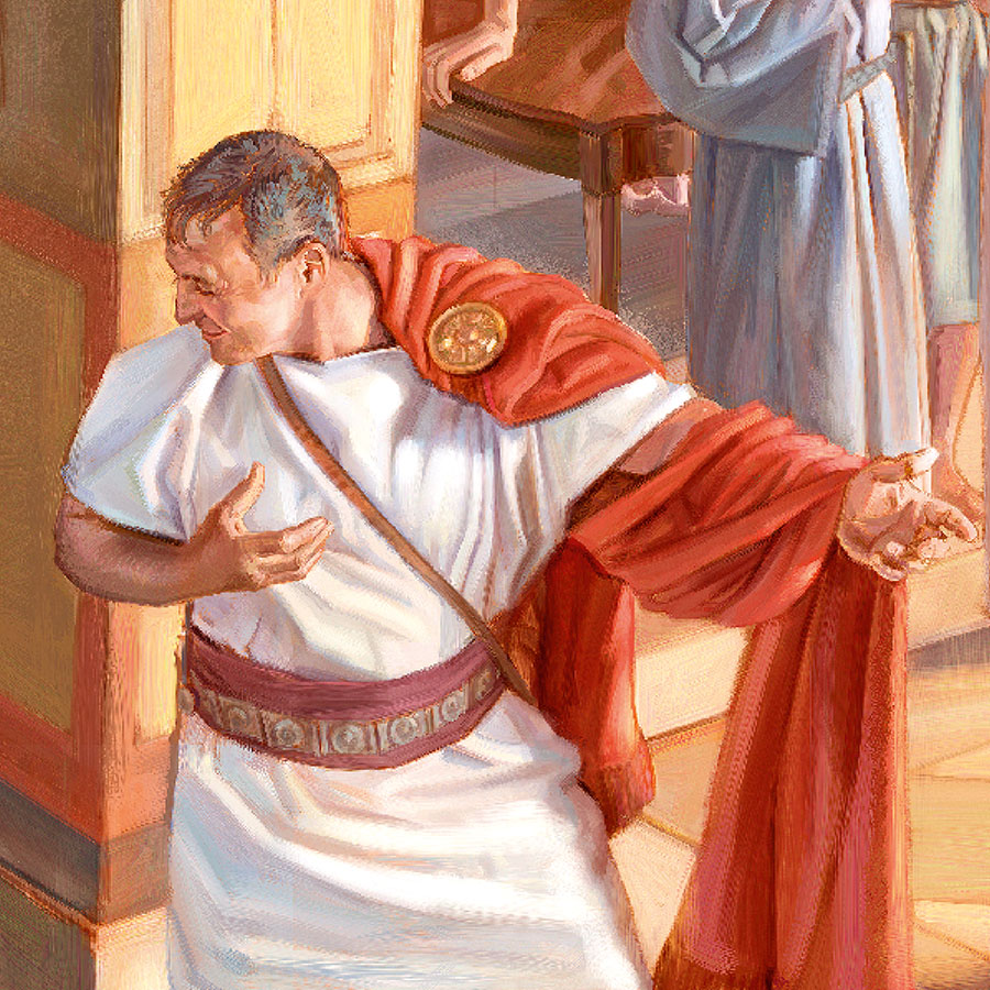 Tsamba 75 Petulo ndi anzake amene ankayenda naye akulowa m’nyumba ya Koneliyo. Koneliyo wapachika chinsalu paphewa lake lakumanzere chosonyeza udindo wake monga kapitawo wa asilikali a Chiroma.