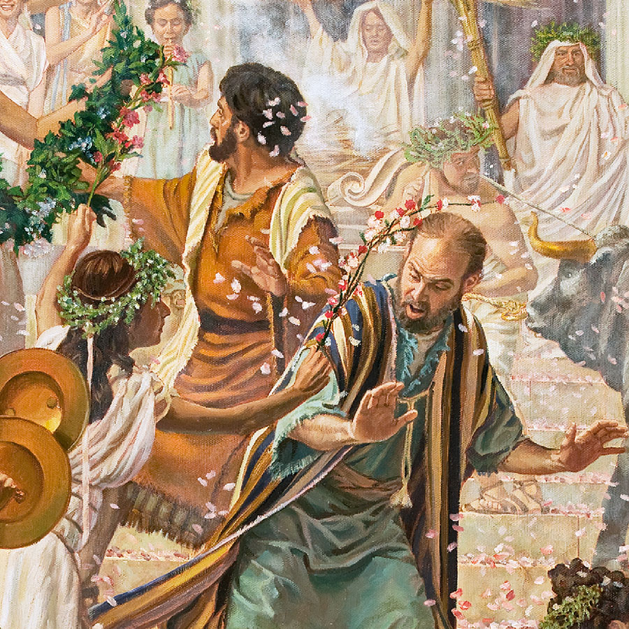 Tsamba 94 Paulo ndi Baranaba akuletsa anthu kuti asawalambire ku Lusitara. Anthu akamapereka nsembe, kawirikawiri ankavala zovala zokongola n’kumaimba nyimbo mokweza kwambiri.