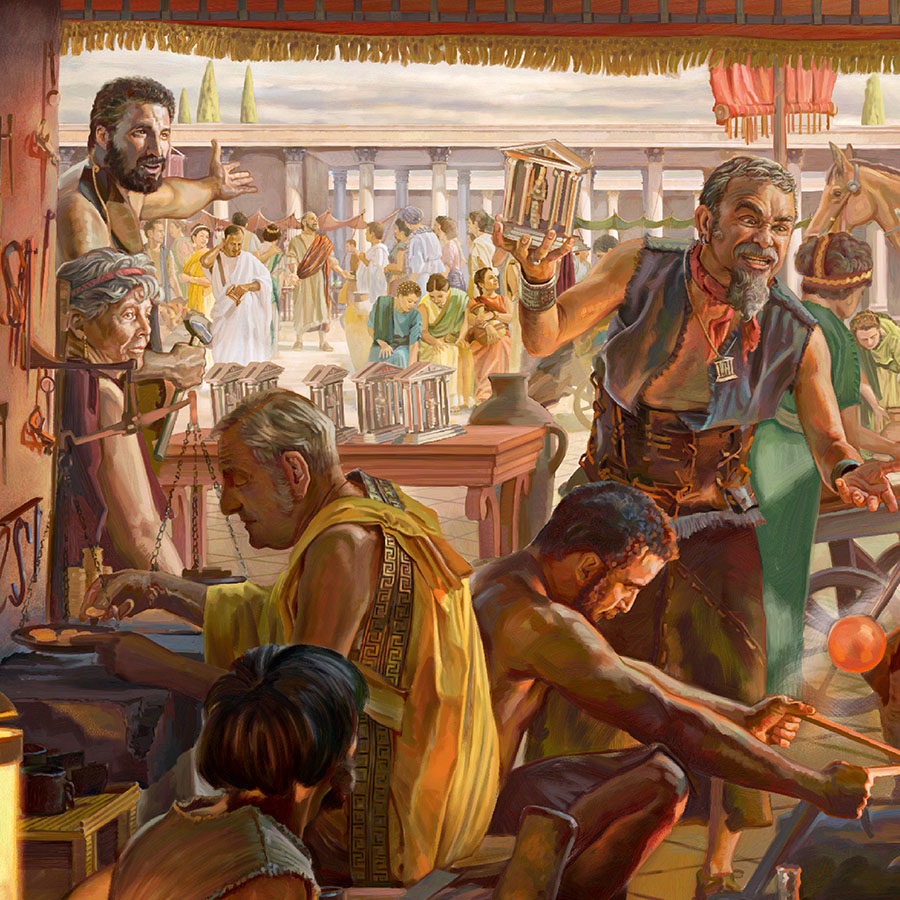 Tsamba 158 Demetiriyo akulankhula ndi amisiri osula siliva m’malo awo ogwirira ntchito ku Efeso. Amisiriwa amagulitsa tiakachisi tasiliva ta Atemi kwa alendo.