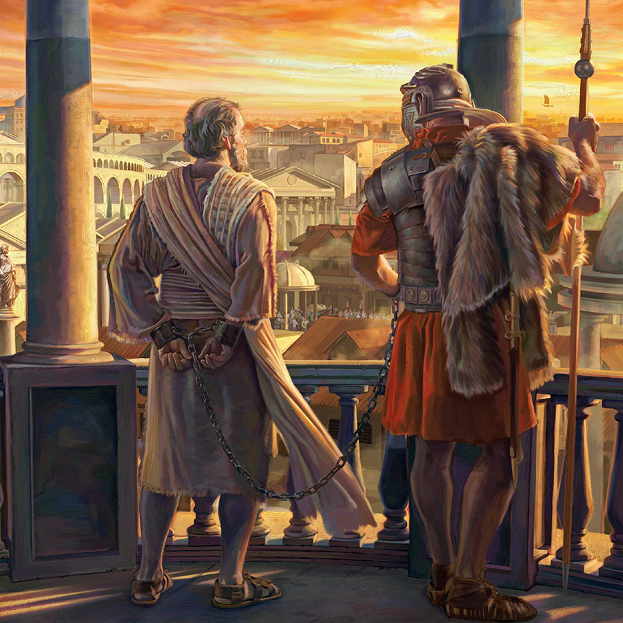 Tsamba 222 Paulo ali mkaidi ndipo amumangirira kwa msilikali wachiroma. Iwo akuyang’ana mbali ina ya mzinda wa Roma.