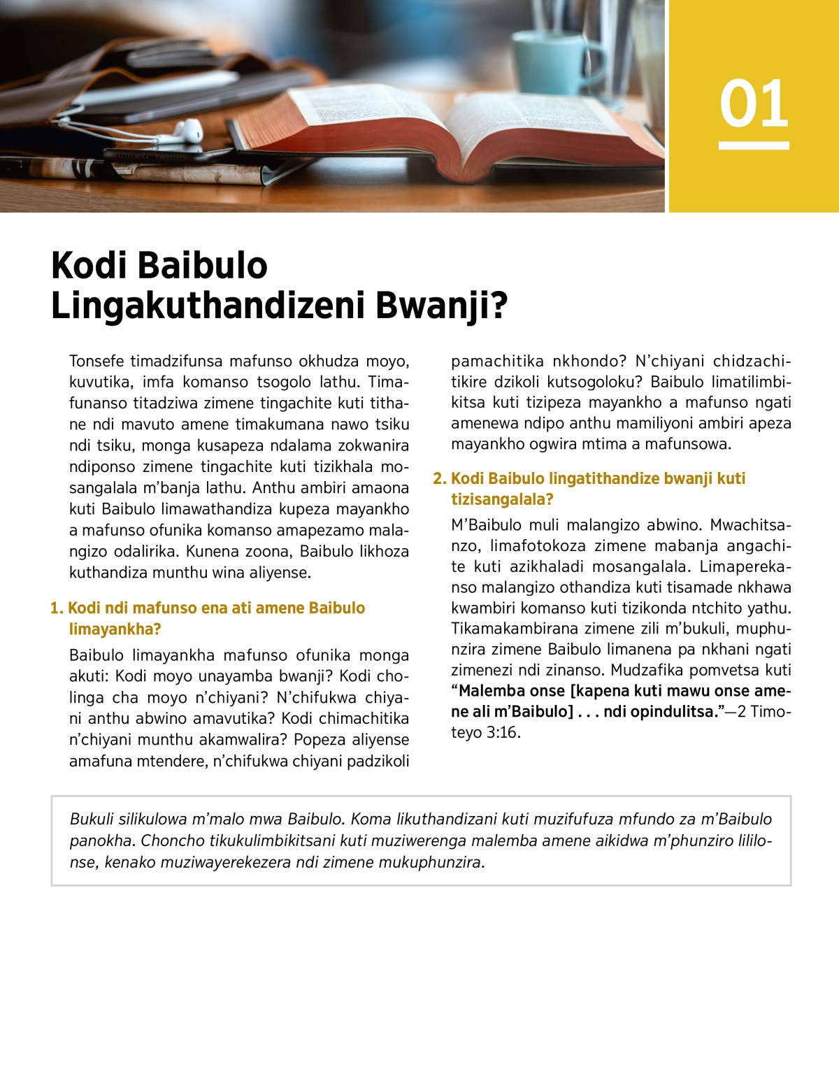 Tonsefe timadzifunsa mafunso okhudza moyo, kuvutika, imfa komanso tsogolo lathu. Timafunanso titadziwa zimene tingachite kuti tithane ndi mavuto amene timakumana nawo tsiku ndi tsiku, monga kusapeza ndalama zokwanira ndiponso zimene tingachite kuti tizikhala mosangalala m’banja lathu. Anthu ambiri amaona kuti Baibulo limawathandiza kupeza mayankho a mafunso ofunika komanso amapezamo malangizo odalirika. Kunena zoona, Baibulo likhoza kuthandiza munthu wina aliyense.