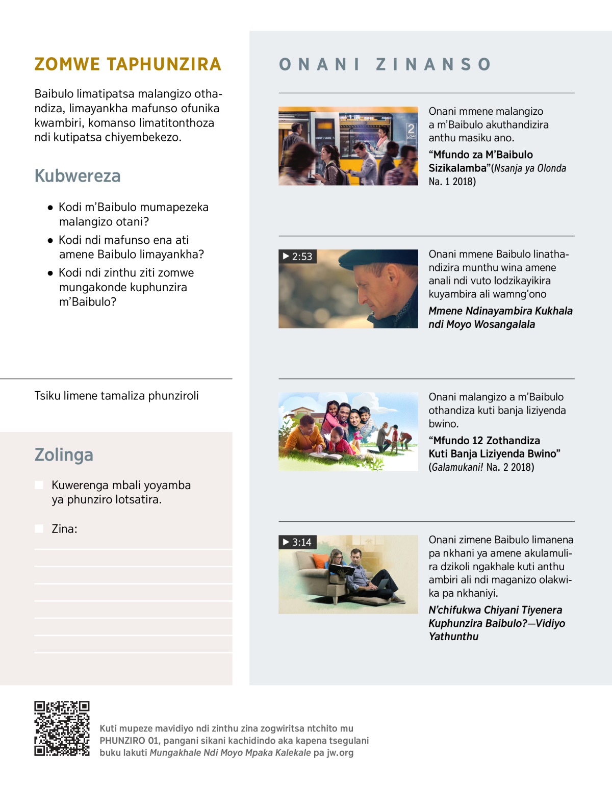 Bukuli silikulowa m’malo mwa Baibulo. Koma likuthandizani kuti muzifufuza mfundo za m’Baibulo panokha. Choncho tikukulimbikitsani kuti muziwerenga malemba amene aikidwa m’phunziro lililonse, kenako muziwayerekezera ndi zimene mukuphunzira.