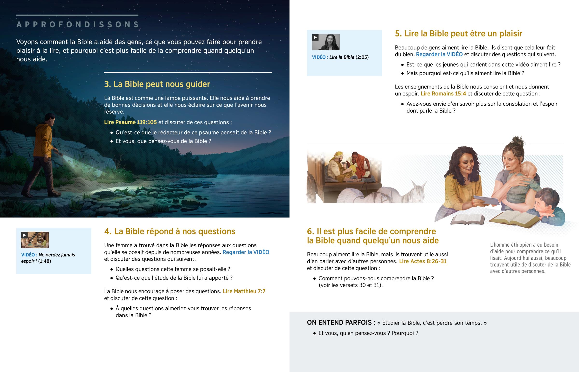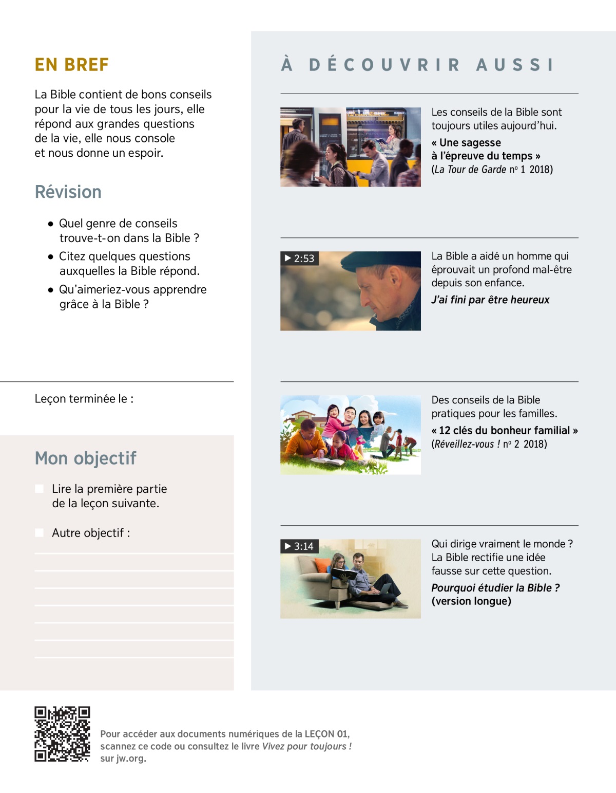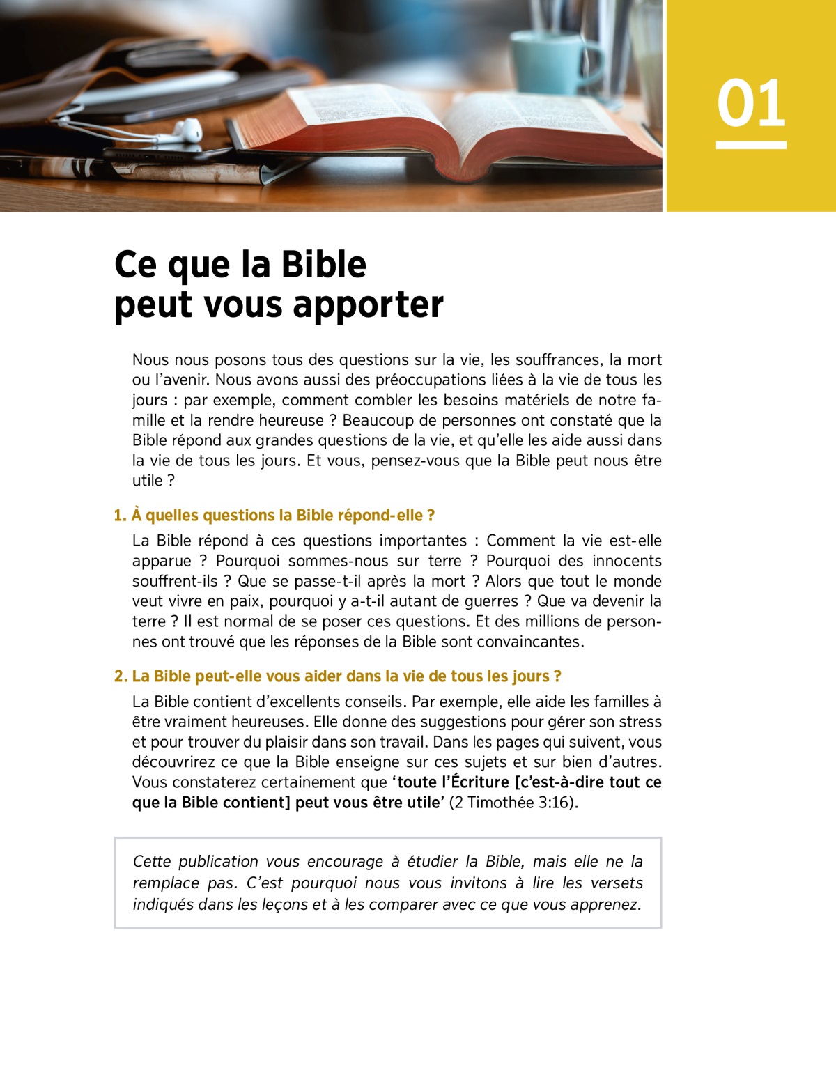 Cette publication vous encourage à étudier la Bible, mais elle ne la remplace pas. C’est pourquoi nous vous invitons à lire les versets indiqués dans les leçons et à les comparer avec ce que vous apprenez.