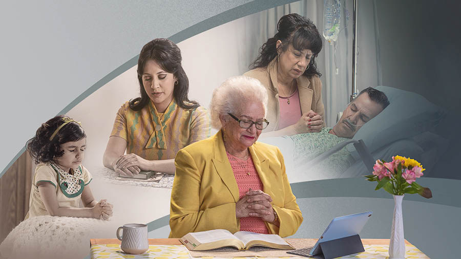 b OPIS OBRÁZKA: Sestra sa už od detstva pravidelne modlí k Jehovovi. Naučili ju to jej rodičia. V mladosti začala slúžiť ako priekopníčka a často prosila Jehovu, aby jej pomáhal v službe. Po rokoch, keď jej manžel vážne ochorel, sa úpenlivo modlila, aby jej dal Jehova silu to zvládnuť. Dnes je už vdova, ale stále vytrváva v modlitbách. Dôveruje, že jej nebeský Otec ju vypočuje, presne tak, ako to robil po celý jej život.