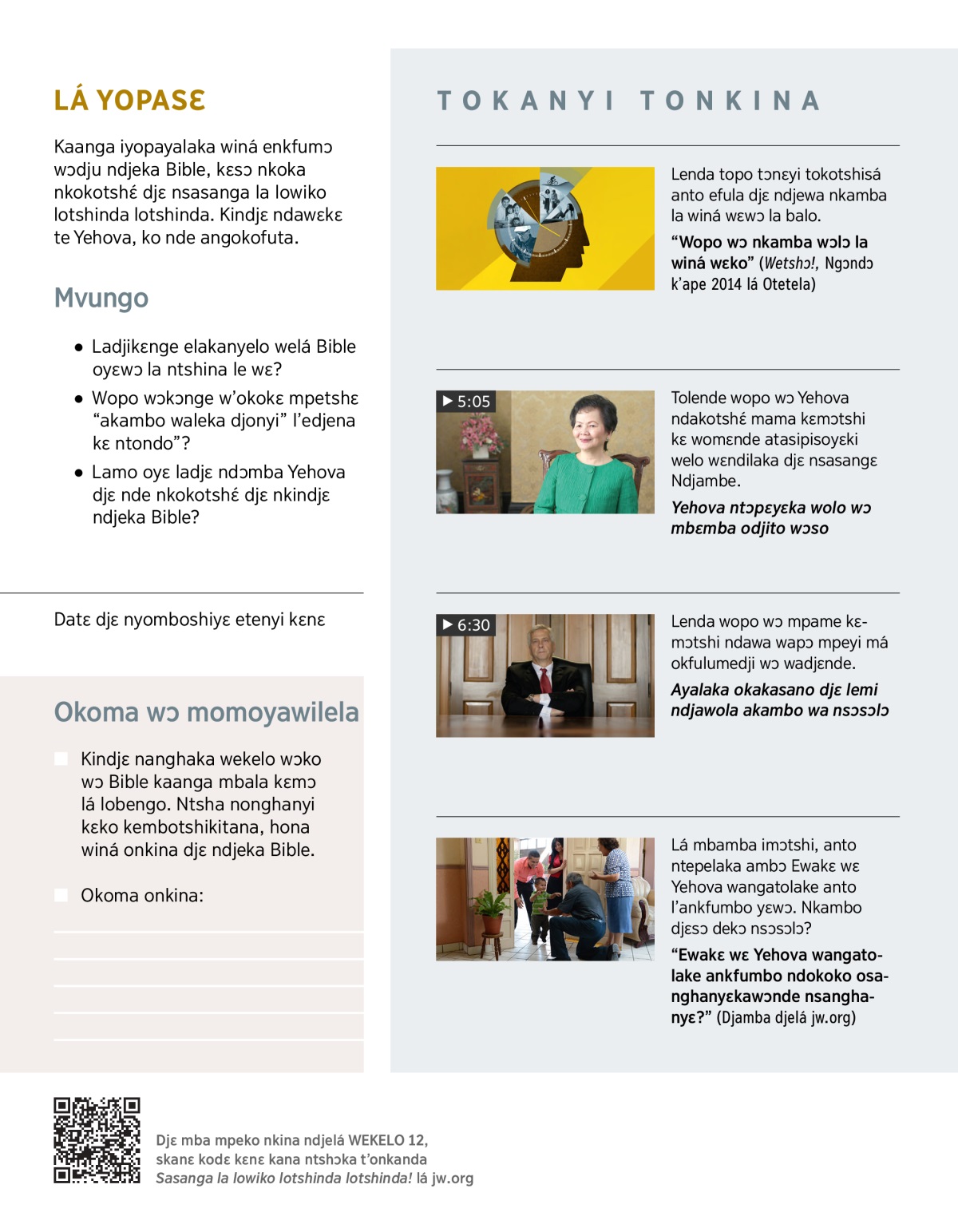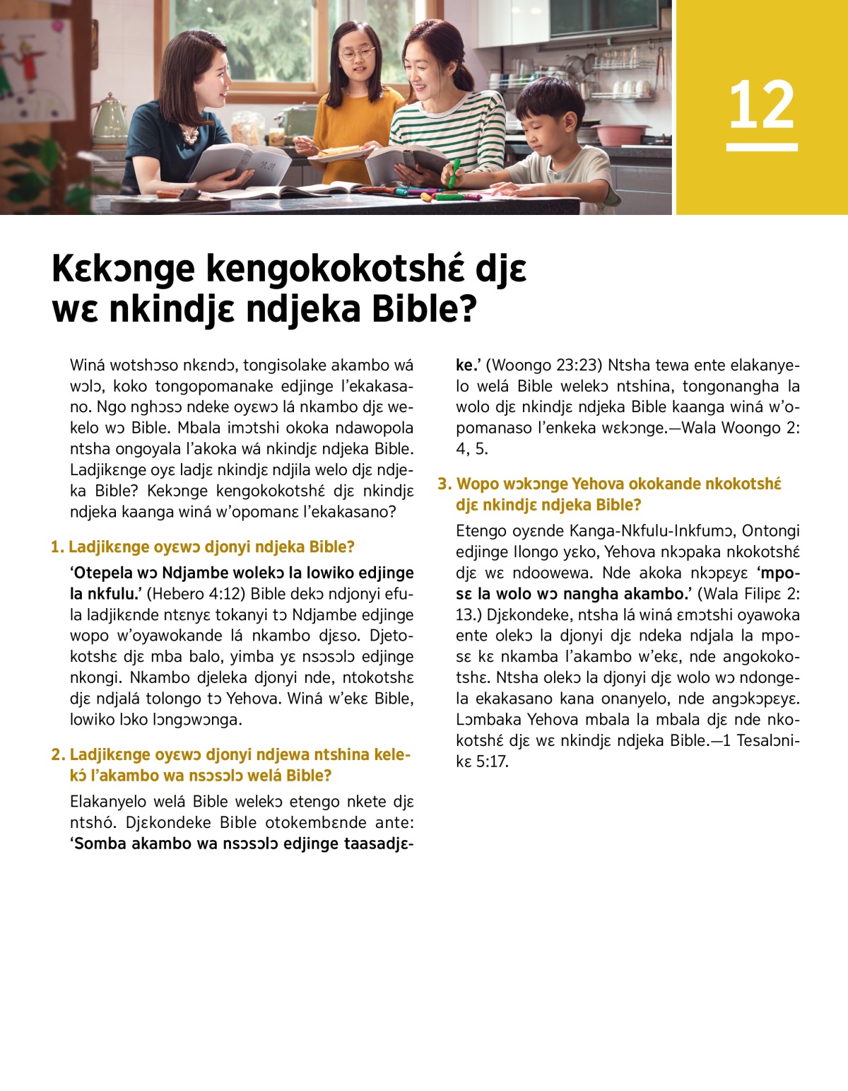 ‘Otepela wɔ Ndjambe wolekɔ la lowiko edjinge la nkfulu.’ (Hebero 4:12) Bible dekɔ ndjonyi efula ladjikɛnde ntɛnyɛ tokanyi tɔ Ndjambe edjinge wopo w’oyawokande lá nkambo djɛso. Djetokotshɛ djɛ mba balo, yimba yɛ nsɔsɔlɔ edjinge nkongi. Nkambo djeleka djonyi nde, ntokotshɛ djɛ ndjalá tolongo tɔ Yehova. Winá w’ekɛ Bible, lowiko lɔko lɔngɔwɔnga.