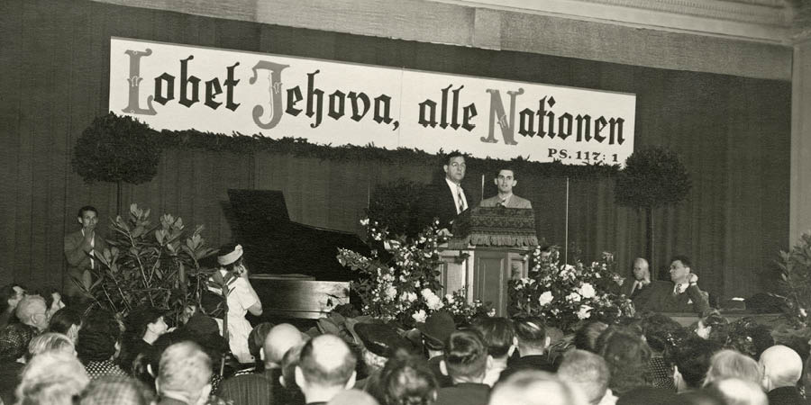 Натан Нор 1947. пред браћом у Визбадену у Немачкој. Иза њега се види годишњи цитат на немачком: „Хвалите Јехову, сви народи“