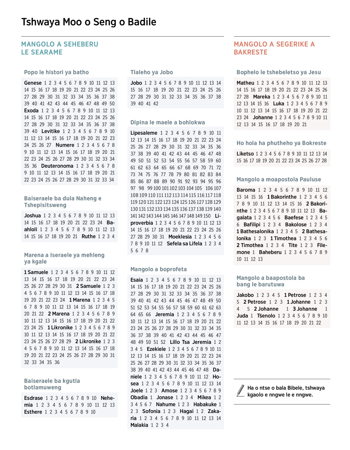 Tshwaya Moo o Seng o Badile E Hatisitsweng Popo le histori ya batho Baiseraele ba dula Naheng e Tshepisitsweng Marena a Iseraele ya mehleng ya kgale Baiseraele ba kgutla botlamuweng Tlaleho ya Jobo Dipina le maele a bohlokwa Mangolo a boprofeta Bophelo le tshebeletso ya Jesu Ho hola ha phutheho ya Bokreste Mangolo a moapostola Pauluse Mangolo a baapostola ba bang le barutuwa Ha o ntse o bala Bibele, tshwaya kgaolo e nngwe le e nngwe. MANGOLO A SEHEBERU LE SEARAME Popo le histori ya batho Genese 1 2 3 4 5 6 7 8 9 10 11 12 13 14 15 16 17 18 19 20 21 22 23 24 25 26 27 28 29 30 31 32 33 34 35 36 37 38 39 40 41 42 43 44 45 46 47 48 49 50 Exoda 1 2 3 4 5 6 7 8 9 10 11 12 13 14 15 16 17 18 19 20 21 22 23 24 25 26 27 28 29 30 31 32 33 34 35 36 37 38 39 40 Levitike 1 2 3 4 5 6 7 8 9 10 11 12 13 14 15 16 17 18 19 20 21 22 23 24 25 26 27 Numere 1 2 3 4 5 6 7 8 9 10 11 12 13 14 15 16 17 18 19 20 21 22 23 24 25 26 27 28 29 30 31 32 33 34 35 36 Deuteronoma 1 2 3 4 5 6 7 8 9 10 11 12 13 14 15 16 17 18 19 20 21 22 23 24 25 26 27 28 29 30 31 32 33 34 Baiseraele ba dula Naheng e Tshepisitsweng Joshua 1 2 3 4 5 6 7 8 9 10 11 12 13 14 15 16 17 18 19 20 21 22 23 24 Baahloli 1 2 3 4 5 6 7 8 9 10 11 12 13 14 15 16 17 18 19 20 21 Ruthe 1 2 3 4 Marena a Iseraele ya mehleng ya kgale 1 Samuele 1 2 3 4 5 6 7 8 9 10 11 12 13 14 15 16 17 18 19 20 21 22 23 24 25 26 27 28 29 30 31 2 Samuele 1 2 3 4 5 6 7 8 9 10 11 12 13 14 15 16 17 18 19 20 21 22 23 24 1 Marena 1 2 3 4 5 6 7 8 9 10 11 12 13 14 15 16 17 18 19 20 21 22 2 Marena 1 2 3 4 5 6 7 8 9 10 11 12 13 14 15 16 17 18 19 20 21 22 23 24 25 1 Likronike 1 2 3 4 5 6 7 8 9 10 11 12 13 14 15 16 17 18 19 20 21 22 23 24 25 26 27 28 29 2 Likronike 1 2 3 4 5 6 7 8 9 10 11 12 13 14 15 16 17 18 19 20 21 22 23 24 25 26 27 28 29 30 31 32 33 34 35 36 Baiseraele ba kgutla botlamuweng Esdrase 1 2 3 4 5 6 7 8 9 10 Nehemia 1 2 3 4 5 6 7 8 9 10 11 12 13 Esthere 1 2 3 4 5 6 7 8 9 10 Tlaleho ya Jobo Jobo 1 2 3 4 5 6 7 8 9 10 11 12 13 14 15 16 17 18 19 20 21 22 23 24 25 26 27 28 29 30 31 32 33 34 35 36 37 38 39 40 41 42 Dipina le maele a bohlokwa Lipesaleme 1 2 3 4 5 6 7 8 9 10 11 12 13 14 15 16 17 18 19 20 21 22 23 24 25 26 27 28 29 30 31 32 33 34 35 36 37 38 39 40 41 42 43 44 45 46 47 48 49 50 51 52 53 54 55 56 57 58 59 60 61 62 63 64 65 66 67 68 69 70 71 72 73 74 75 76 77 78 79 80 81 82 83 84 85 86 87 88 89 90 91 92 93 94 95 96 97 98 99 100 101 102 103 104 105 106 107 108 109 110 111 112 113 114 115 116 117 118 119 120 121 122 123 124 125 126 127 128 129 130 131 132 133 134 135 136 137 138 139 140 141 142 143 144 145 146 147 148 149 150 Liproverbia 1 2 3 4 5 6 7 8 9 10 11 12 13 14 15 16 17 18 19 20 21 22 23 24 25 26 27 28 29 30 31 Moeklesia 1 2 3 4 5 6 7 8 9 10 11 12 Sefela sa Lifela 1 2 3 4 5 6 7 8 Mangolo a boprofeta Esaia 1 2 3 4 5 6 7 8 9 10 11 12 13 14 15 16 17 18 19 20 21 22 23 24 25 26 27 28 29 30 31 32 33 34 35 36 37 38 39 40 41 42 43 44 45 46 47 48 49 50 51 52 53 54 55 56 57 58 59 60 61 62 63 64 65 66 Jeremia 1 2 3 4 5 6 7 8 9 10 11 12 13 14 15 16 17 18 19 20 21 22 23 24 25 26 27 28 29 30 31 32 33 34 35 36 37 38 39 40 41 42 43 44 45 46 47 48 49 50 51 52 Lillo Tsa Jeremia 1 2 3 4 5 Ezekiele 1 2 3 4 5 6 7 8 9 10 11 12 13 14 15 16 17 18 19 20 21 22 23 24 25 26 27 28 29 30 31 32 33 34 35 36 37 38 39 40 41 42 43 44 45 46 47 48 Daniele 1 2 3 4 5 6 7 8 9 10 11 12 Hosea 1 2 3 4 5 6 7 8 9 10 11 12 13 14 Joele 1 2 3 Amose 1 2 3 4 5 6 7 8 9 Obadia 1 Jonase 1 2 3 4 Mikea 1 2 3 4 5 6 7 Nahume 1 2 3 Habakuke 1 2 3 Sofonia 1 2 3 Hagai 1 2 Zakaria 1 2 3 4 5 6 7 8 9 10 11 12 13 14 Malakia 1 2 3 4 MANGOLO A SEGERIKE A BAKRESTE Bophelo le tshebeletso ya Jesu Matheu 1 2 3 4 5 6 7 8 9 10 11 12 13 14 15 16 17 18 19 20 21 22 23 24 25 26 27 28 Mareka 1 2 3 4 5 6 7 8 9 10 11 12 13 14 15 16 Luka 1 2 3 4 5 6 7 8 9 10 11 12 13 14 15 16 17 18 19 20 21 22 23 24 Johanne 1 2 3 4 5 6 7 8 9 10 11 12 13 14 15 16 17 18 19 20 21 Ho hola ha phutheho ya Bokreste Liketso 1 2 3 4 5 6 7 8 9 10 11 12 13 14 15 16 17 18 19 20 21 22 23 24 25 26 27 28 Mangolo a moapostola Pauluse Baroma 1 2 3 4 5 6 7 8 9 10 11 12 13 14 15 16 1 Bakorinthe 1 2 3 4 5 6 7 8 9 10 11 12 13 14 15 16 2 Bakorinthe 1 2 3 4 5 6 7 8 9 10 11 12 13 Bagalata 1 2 3 4 5 6 Baefese 1 2 3 4 5 6 Bafilipi 1 2 3 4 Bakolose 1 2 3 4 1 Bathesalonika 1 2 3 4 5 2 Bathesalonika 1 2 3 1 Timothea 1 2 3 4 5 6 2 Timothea 1 2 3 4 Tite 1 2 3 Filemone 1 Baheberu 1 2 3 4 5 6 7 8 9 10 11 12 13 Mangolo a baapostola ba bang le barutuwa Jakobo 1 2 3 4 5 1 Petrose 1 2 3 4 5 2 Petrose 1 2 3 1 Johanne 1 2 3 4 5 2 Johanne 1 3 Johanne 1 Juda 1 Tšenolo 1 2 3 4 5 6 7 8 9 10 11 12 13 14 15 16 17 18 19 20 21 22