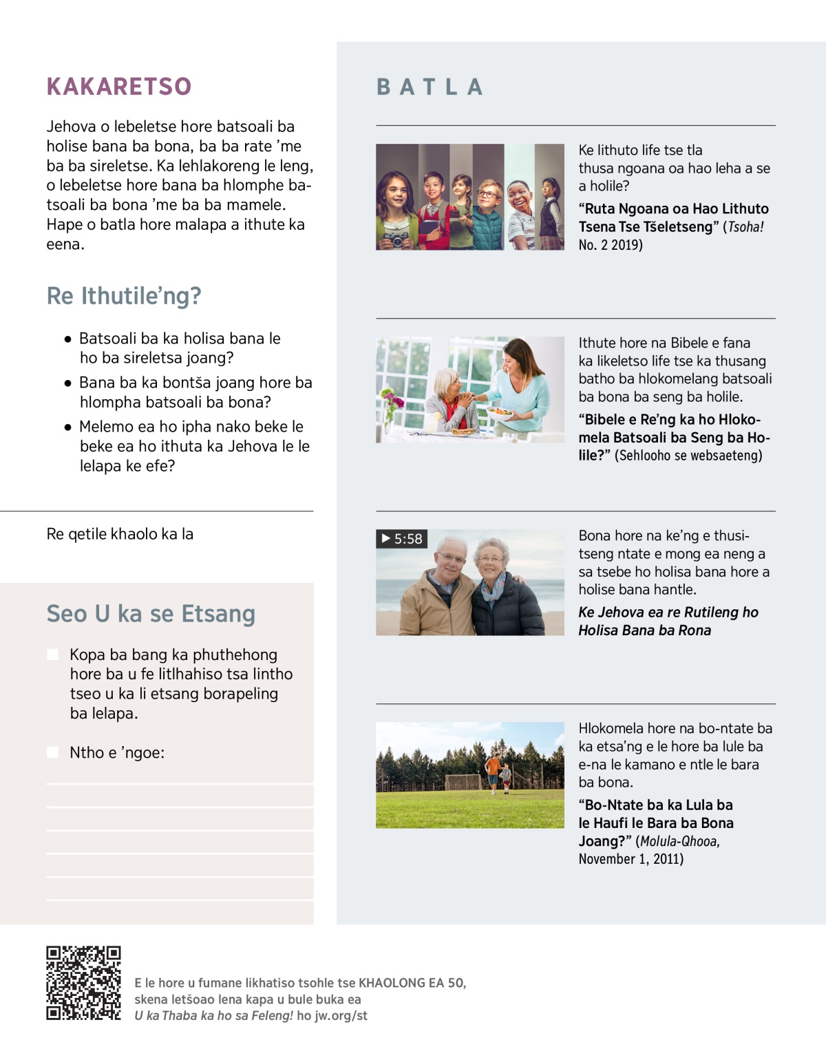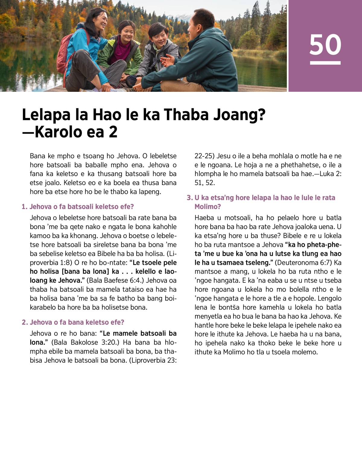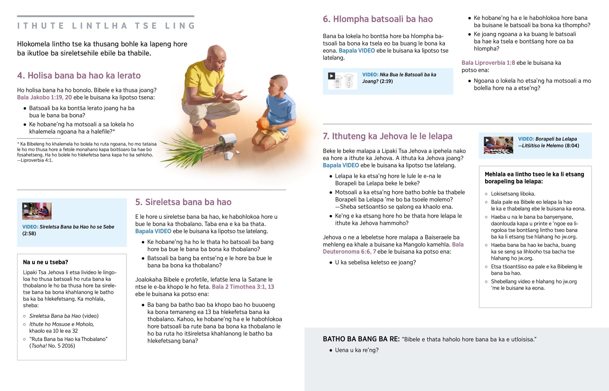 Haeba u motsoali, ha ho pelaelo hore u batla hore bana ba hao ba rate Jehova joaloka uena. U ka etsa’ng hore u ba thuse? Bibele e re u lokela ho ba ruta mantsoe a Jehova “ka ho pheta-pheta ’me u bue ka ’ona ha u lutse ka tlung ea hao le ha u tsamaea tseleng.” (Deuteronoma 6:7) Ka mantsoe a mang, u lokela ho ba ruta ntho e le ’ngoe hangata. E ka ’na eaba u se u ntse u tseba hore ngoana u lokela ho mo bolella ntho e le ’ngoe hangata e le hore a tle a e hopole. Lengolo lena le bontša hore kamehla u lokela ho batla menyetla ea ho bua le bana ba hao ka Jehova. Ke hantle hore beke le beke lelapa le ipehele nako ea hore le ithute ka Jehova. Le haeba ha u na bana, ho ipehela nako ka thoko beke le beke hore u ithute ka Molimo ho tla u tsoela molemo.